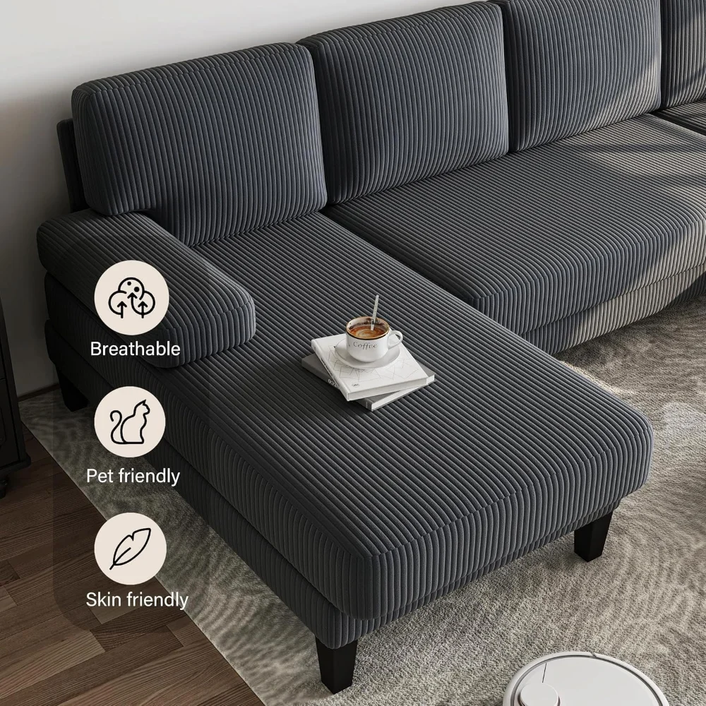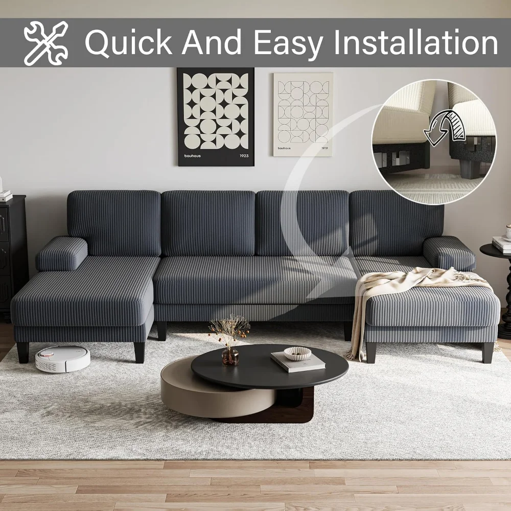 112'' Corduroy U Shaped Couch with Sleeper Lounge Chaise, 4 Seat Modern Comfy Sectional Sofa Couches for Living Room
