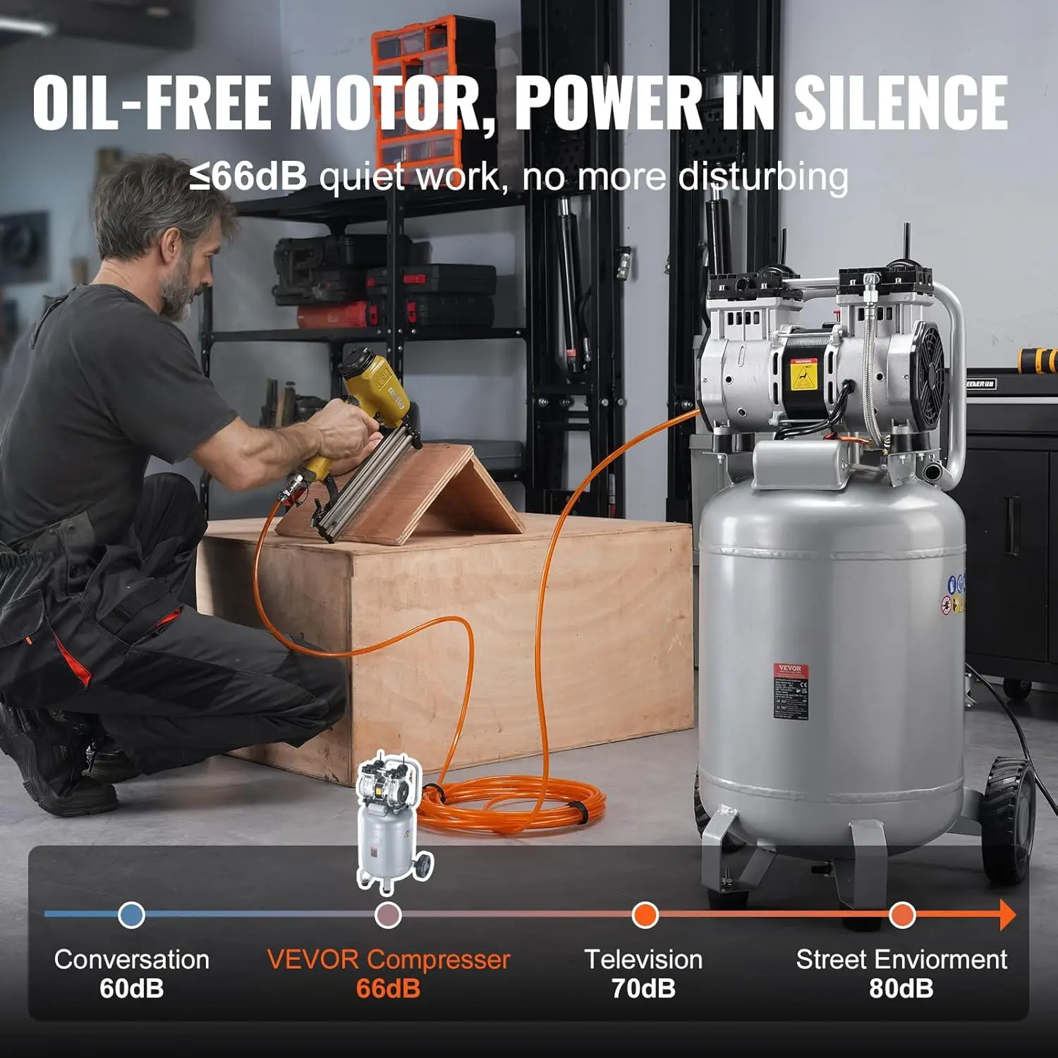 Quiet Operation: The 66dB low-noise air compressor uses oil-free technology, significantly reducing operational sound interference, creating a quieter work environment, and improving your efficiency.