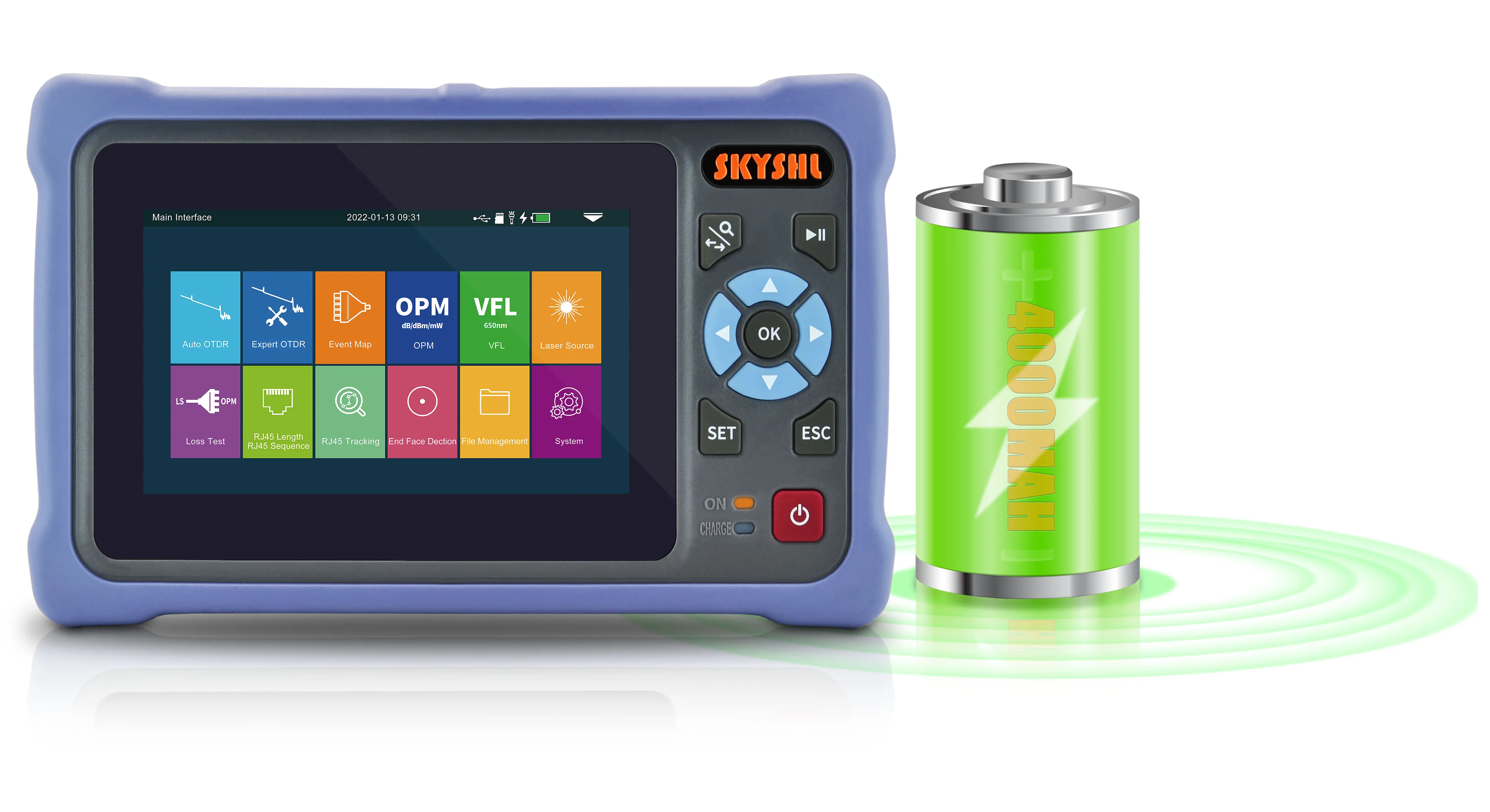 SKYSHL SS304T-2A integrates all the basic functions for testing fibers, including (Auto OTDR/Expert OTDR-1310nm+1550nm/26dB+24dB), visual fault location (650nm,10km), optical power meter (OPM-850nm-1650nm/-50~+26db),optical light source (OLS-1310nm+1550nm),Optical Loss Test(OFLT-1310nm+1550nm) and RJ45 Cable Tracker(Test Distance>300m). Engineers no longer have to carry a lot of equipment when working outdoors.
