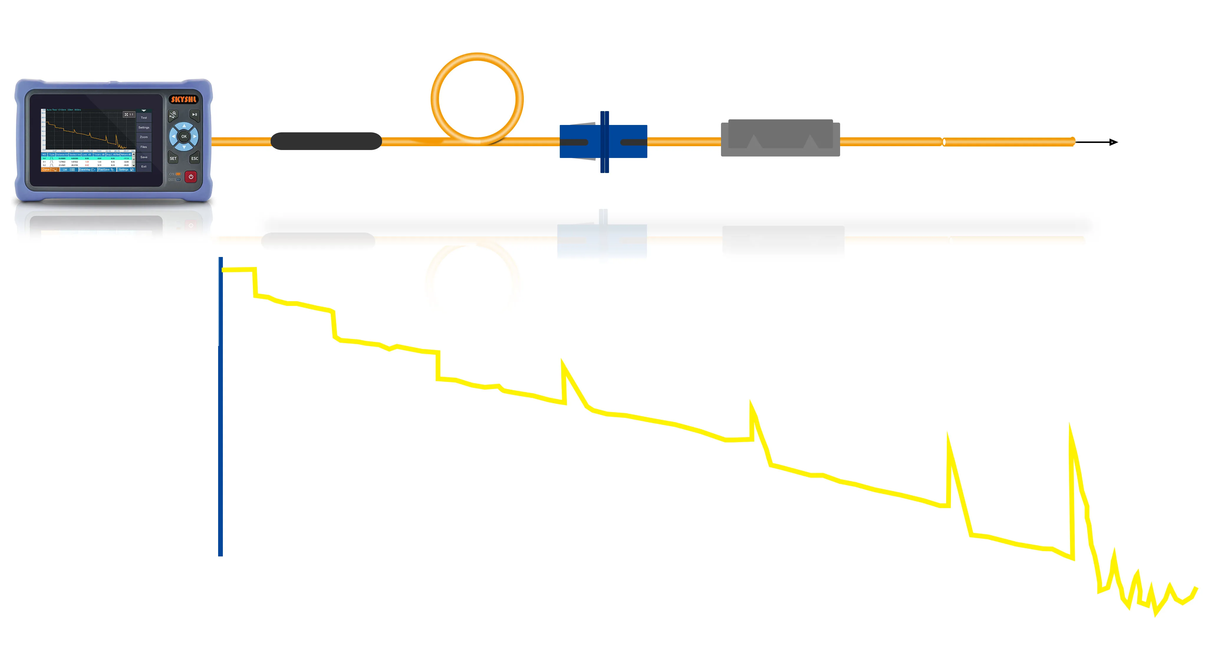The slope of the fiber trace shows the attenuation coefficient of the fiber and is calibrated in dB/km by the OTDR. Connectors and splices are called "events" in OTDR jargon. Both should show a loss, but connectors and mechanical splices will also show a reflective peak. The height of that peak will indicate the amount of reflection at the event.