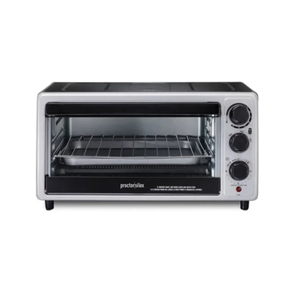 It's powerful with 1500 watts and gives you the versatility to cook 3 ways — bake, broil or  toast.  It's perfect for everyday jobs like making toast, cooking frozen meals and reheating leftovers yet can do more, like bake a small batch of brownies or broil chicken breasts for dinner.  The toaster oven broiler has simple manual controls that are straightforward and easy to use.  It's great for seniors or anyone who wants a toaster oven that efficiently does the job without being complicated.  The toaster oven has patented contoured knobs, a 30 minute timer with Stay On function for baking, ready bell and auto shutoff.  A baking pan and oven rack are included, and the slideout crumb tray makes cleanup easy.  Whether you're cooking a slice of frozen pizza or making a tuna melt, you'll easily cook a variety of foods in the toaster oven, with temperature options ranging from 150-450° F.