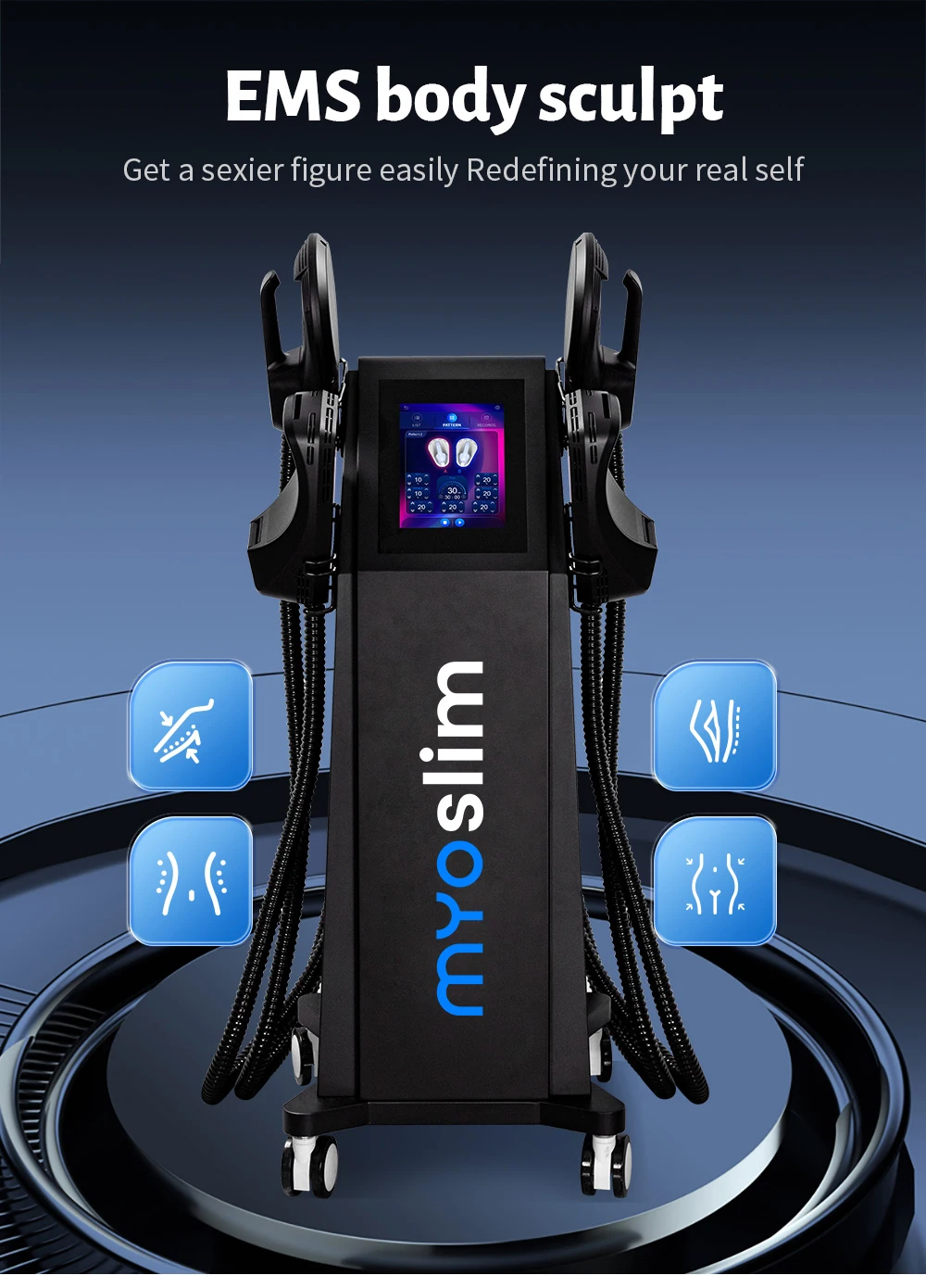 The device generates an electromagnetic field that forces targeted muscle groups (such as abs or glutes) to undergo extremely intense contractions. This level of contraction intensity cannot be achieved through voluntary effort (e.g., during crunches or squats). A single 30-minute EMS session is equivalent to performing tens of thousands of deep crunches or hip thrusts within a short time frame.