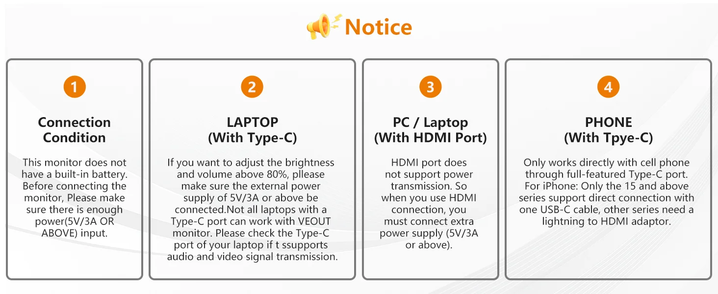 Plug and Play External Monitor: VEOUT portable laptop monitor just got even more convenient with plug-and-play functionality. Simply connect to power and display signal transmission using a USB Type-C cable - no drivers needed. With 2 full-featured Type-C ports and a mini HDMI port, easily connect to your laptop, PC, cell phone, Mac, PS5/PS4, and Switch for seamless connectivity on-the-go. (Note: Thunderbolt 3.0 or USB 3.1 Type C DP ALT-MODE required for compatibility);Type-C supports up to 144Hz;HDMI supports up to 120Hz;