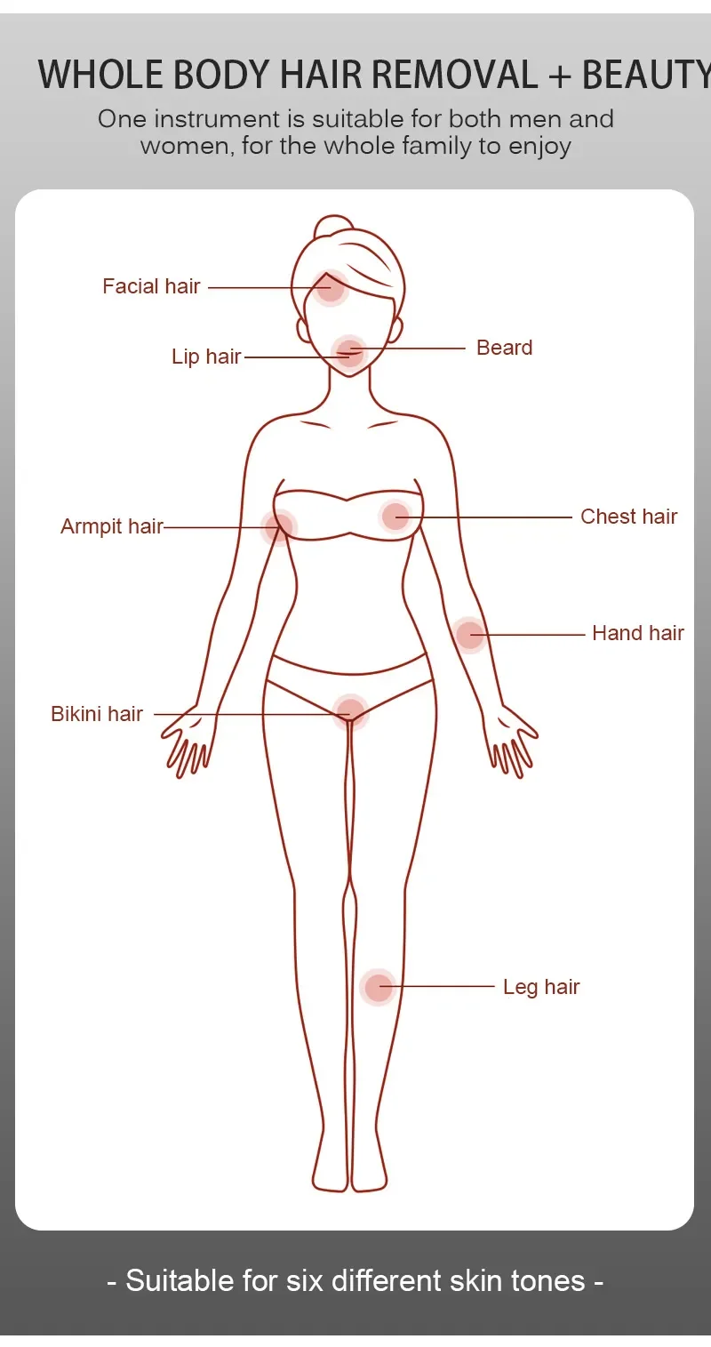 5.Removal Area: Nose Hair,Ear Hair,Lip Hair, Beard, Chest Hair, Armpit Hair, Back Hair, Arm Hair, Leg Hair, Unwanted Hair outside the Bikini Line.