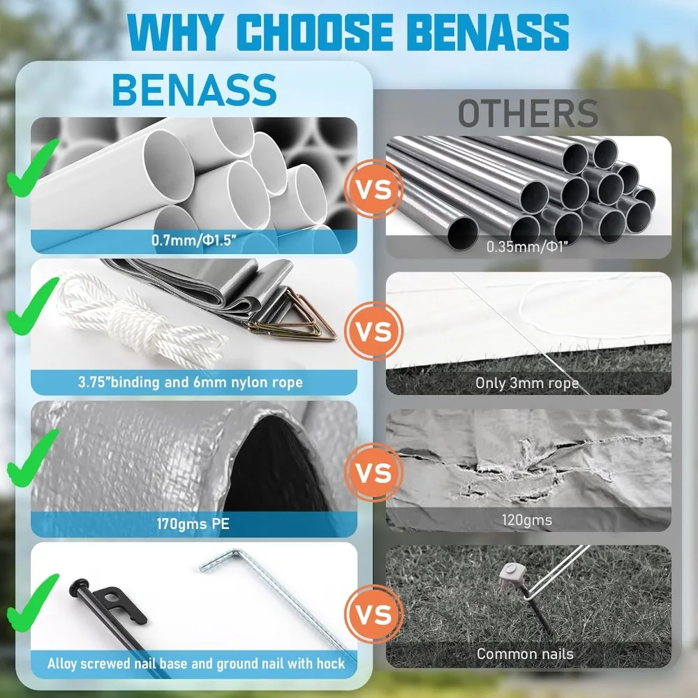 - Super Heavy Duty - portable garage use 1.5" galvanized steel frame and 180gms PE canopy top, is more durable than others. Adding the accessories set, it will be firmer