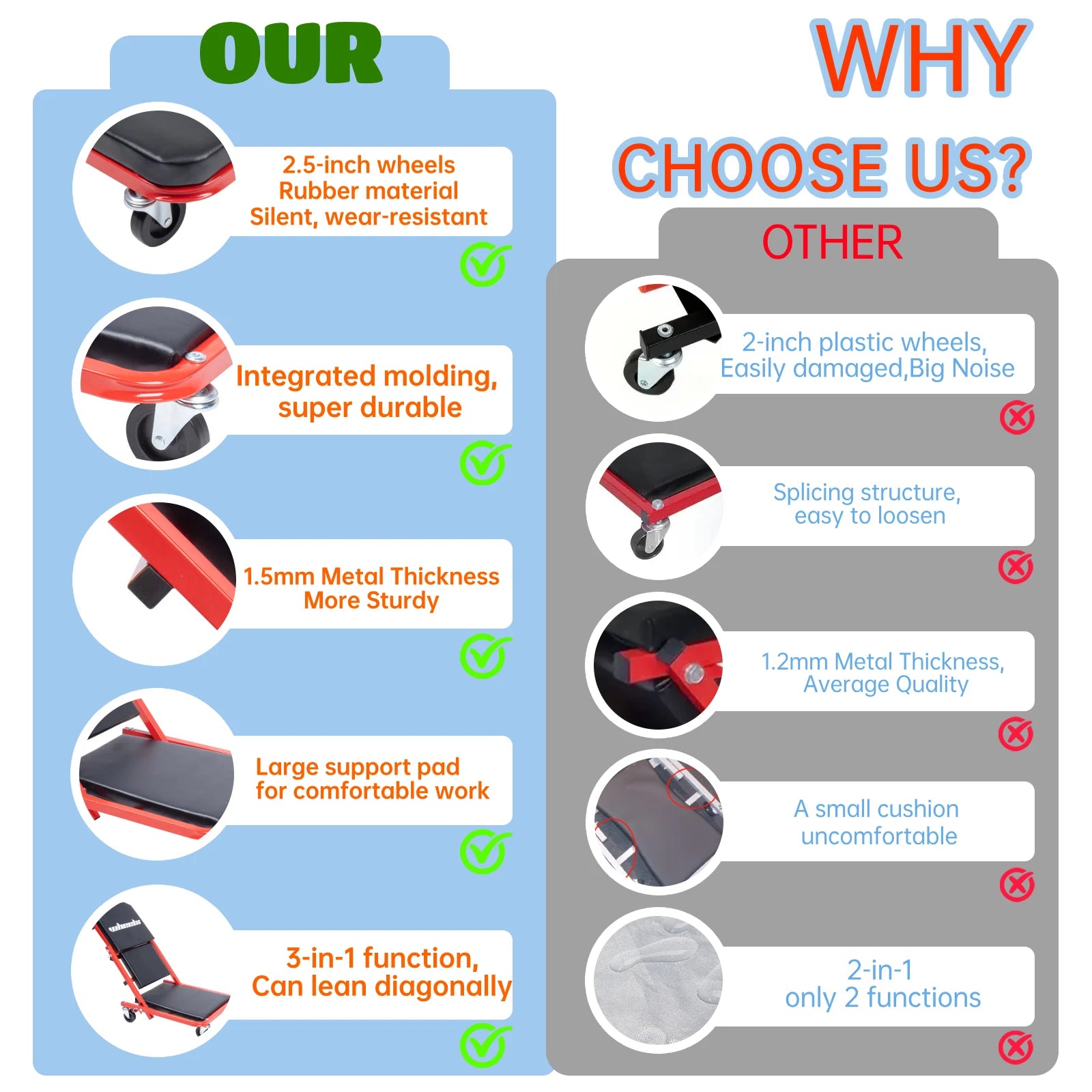 3-in-1 Rolling Mechanic Creeper Z Seat, Foldable Garage Chair Lay Down Sit Lean Back, Under Car Shop Auto Repair, Red Black