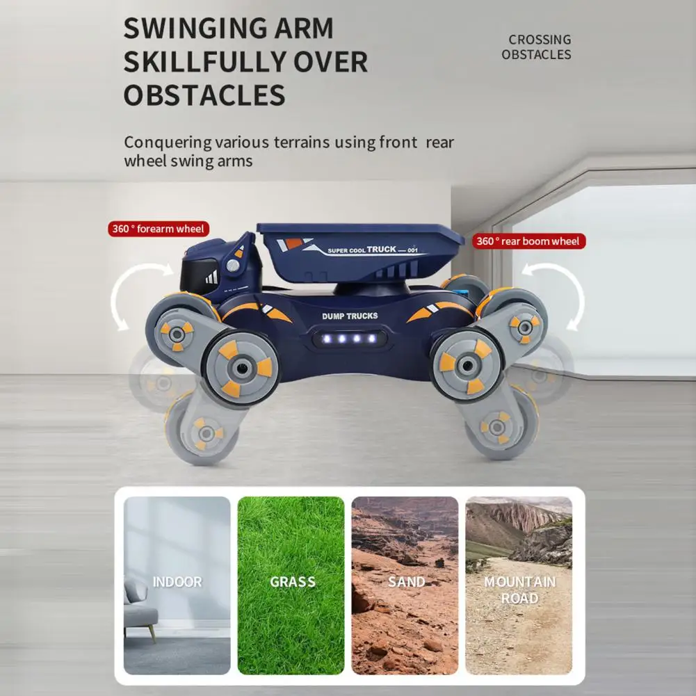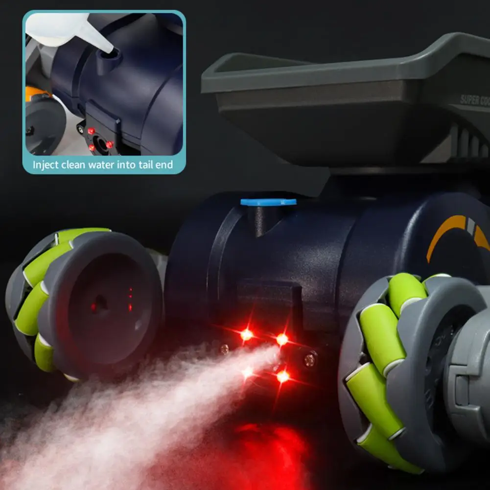 Enjoy the vibrant display of colorful lights and music, along with the spray function that simulates nitrogen for an NOS effect. Conquer various terrains with the front and rear swing arm climbing feature, and master obstacles with skillful gesture control.