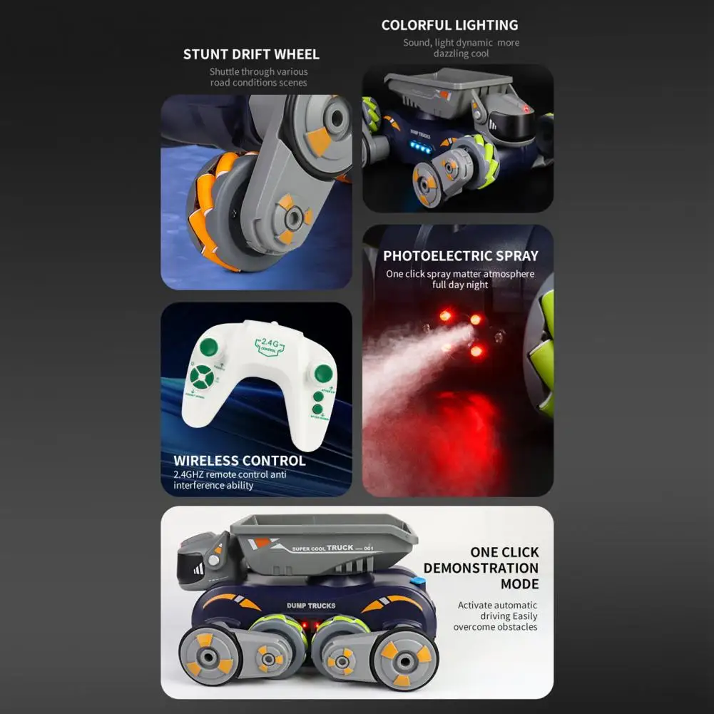 Multi-Functionality Galore: Unleash the power of four-wheel drive capabilities combined with forward, backward, left, and right drift movements. Engage with colorful lights, music accompaniment, and a unique spray function that adds an extra layer of excitement to your RC car adventures.