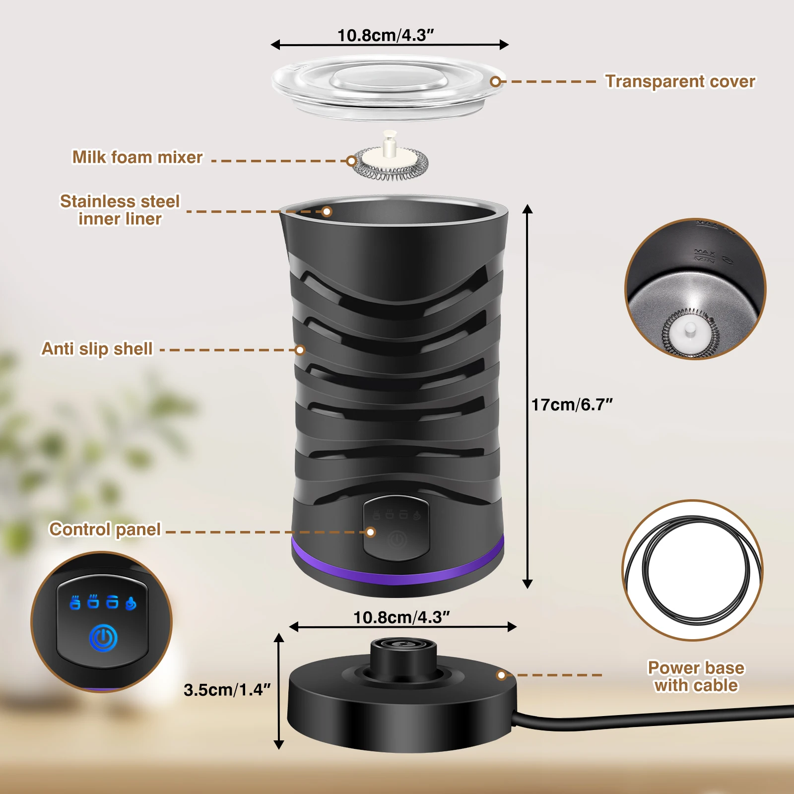 * Fast, Safe, Quiet Operation: The electric milk frother produces rich, velvety foam in just 2 minutes and heats milk in 4 minutes. The operation is quiet, providing a comfortable experience. Overheating protection prevents the machine from damage due to overheating.
