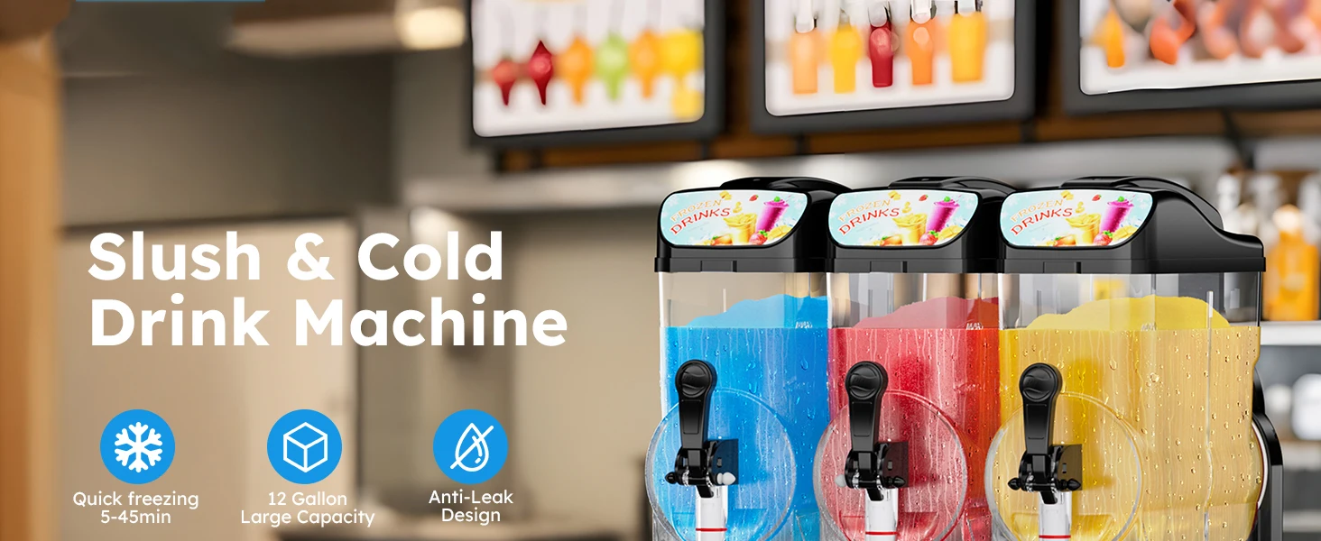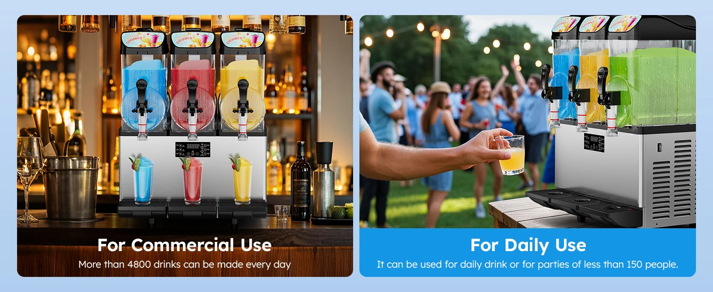 ✅ Unrivaled 12-Gallon Capacity: Serve 225+ cups (7oz each) with three 15L/4-gallon tanks—perfect for stadiums, festivals, food courts, or massive parties needing three flavors or simultaneous slush/cocktail/cold drink service.