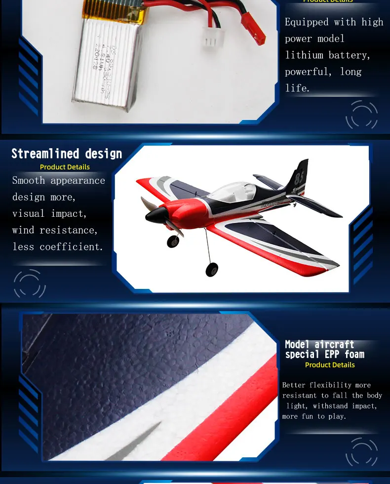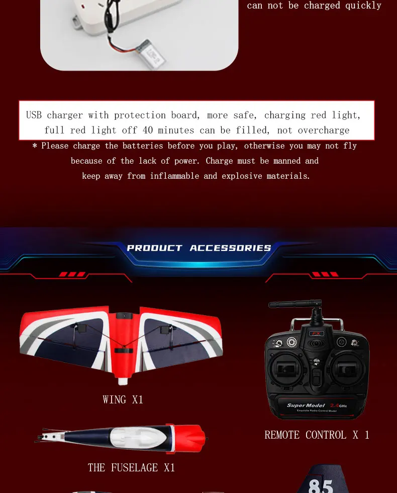 Product details : color box packaging *1, foam inner box *1, fuselage, main wing *1 set, horizontal tail *1 set, remote control *1, manual *1, battery *1, USB charger *1, spare blade *1.