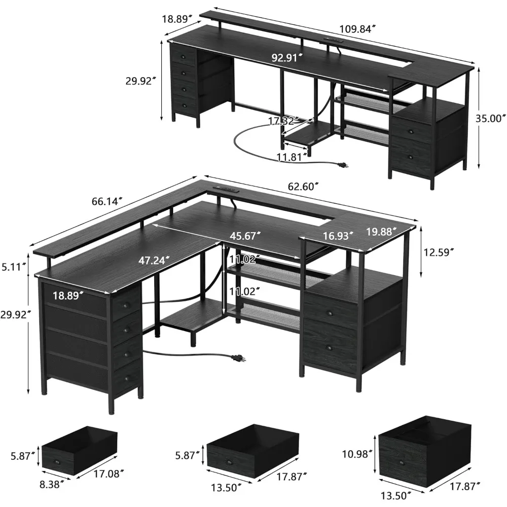 - What You Get: L shaped gaming desk comes with 5 fabric file drawer, 1 fabric file cabinet, 1 full monitor stand, 1 CPU stand, 2-tier under-desk storage shelves, 1 printer stand, power outlets, LED lights; An ideal corner desk for your home office