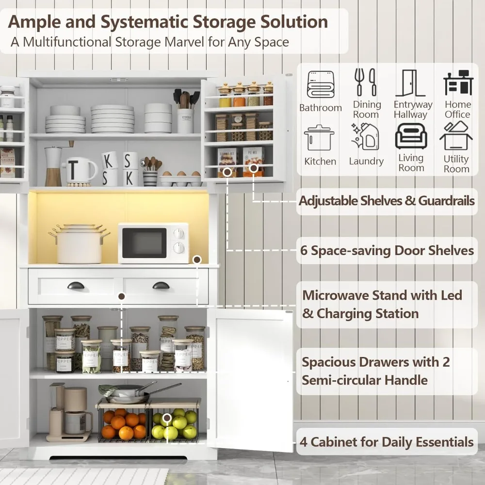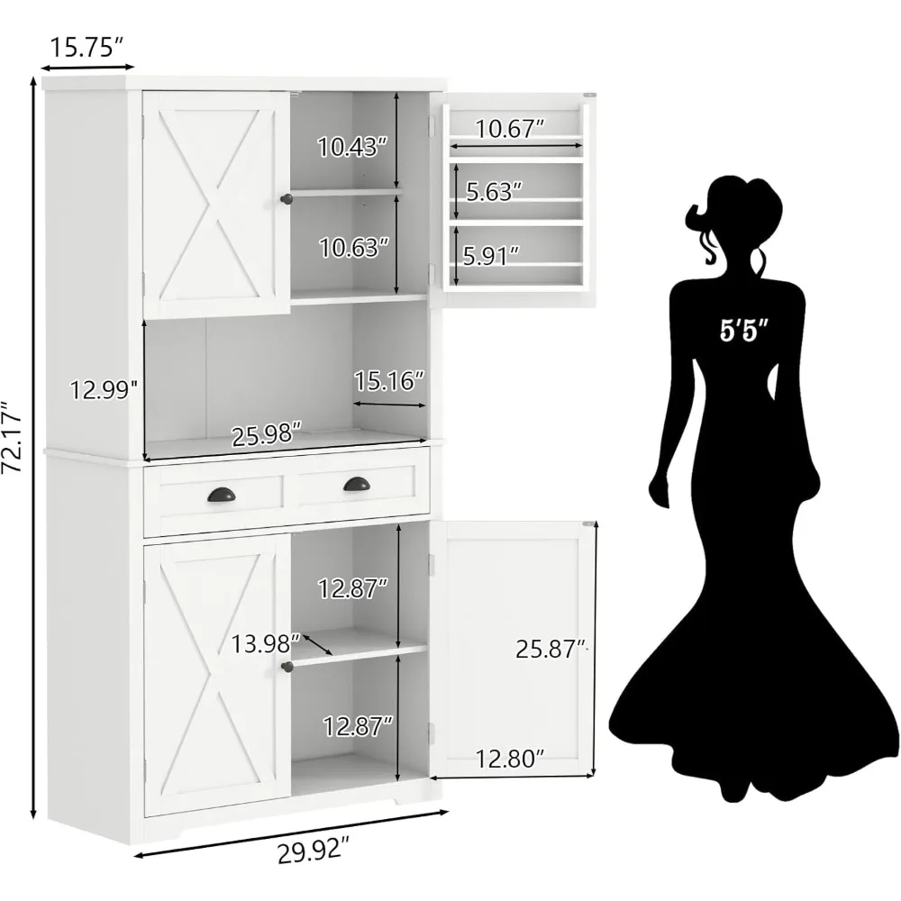 - [Perfect Storage Solution] This 72" Kitchen Pantry Cabinet emanates a farmhouse elegance, artfully blending functionality with aesthetic charm. The smooth-gliding drawers and adjustable shelf allow for effortless access to kinds of essentials. Each meticulously designed compartments provides an organized haven for everything from food and utensils to delicate accessories. The spacious operation table is ideal for accommodating microwaves, there is a built-in charging board on the countertop with 2 AC plugs and 2 USB ports.The vertical orientation of this cabinet optimizes space utilization, making it an ideal solution for keeping dining room items tidy.