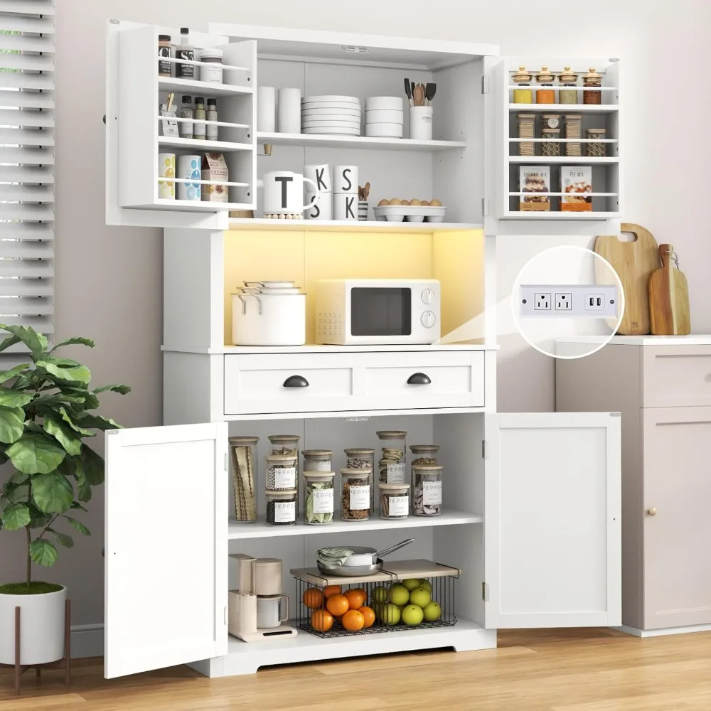- [Convenient USB Charging Station] The storage cabinet is thoughtfully designed with two AC power outlets and two USB ports, seamlessly blending practicality with modern convenience. Imagine effortlessly charging your devices while you prepare for the day, with ample space to organize your daily essentials and personal items. Whether it's powering your CD player, microwaves, coffee machines or keeping your phone within easy reach, this kitchen pantry cabinet transforms your daily routine into a luxurious experience. Its elegant silhouette enhances any room decor, making it not just a functional piece, but a stylish focal point that elevates your space.