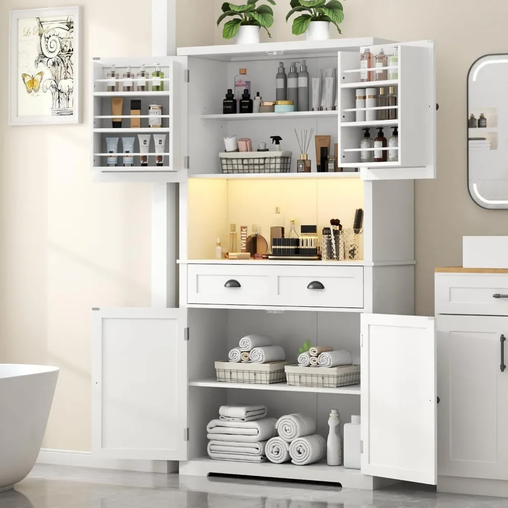 - [Large Capacity Storage Cabinet] This tall pantry storage cabinet comes with 1 large center drawer, 2 large double-door storage cabinets, and 2 adjustable shelves. In addition, the upper door cabinet also has 6 hanging shelves for storing your olive oil, spices and other kitchen items easy to find and access.The spacious desktop can accommodate household appliances such as coffee machines, keeping everything organized and in order.Whether you're brewing a cup of coffee in the morning or gathering with your family and friends at night, this versatile storage cabinet can meet your needs at different times and create memorable moments for you and your loved ones.