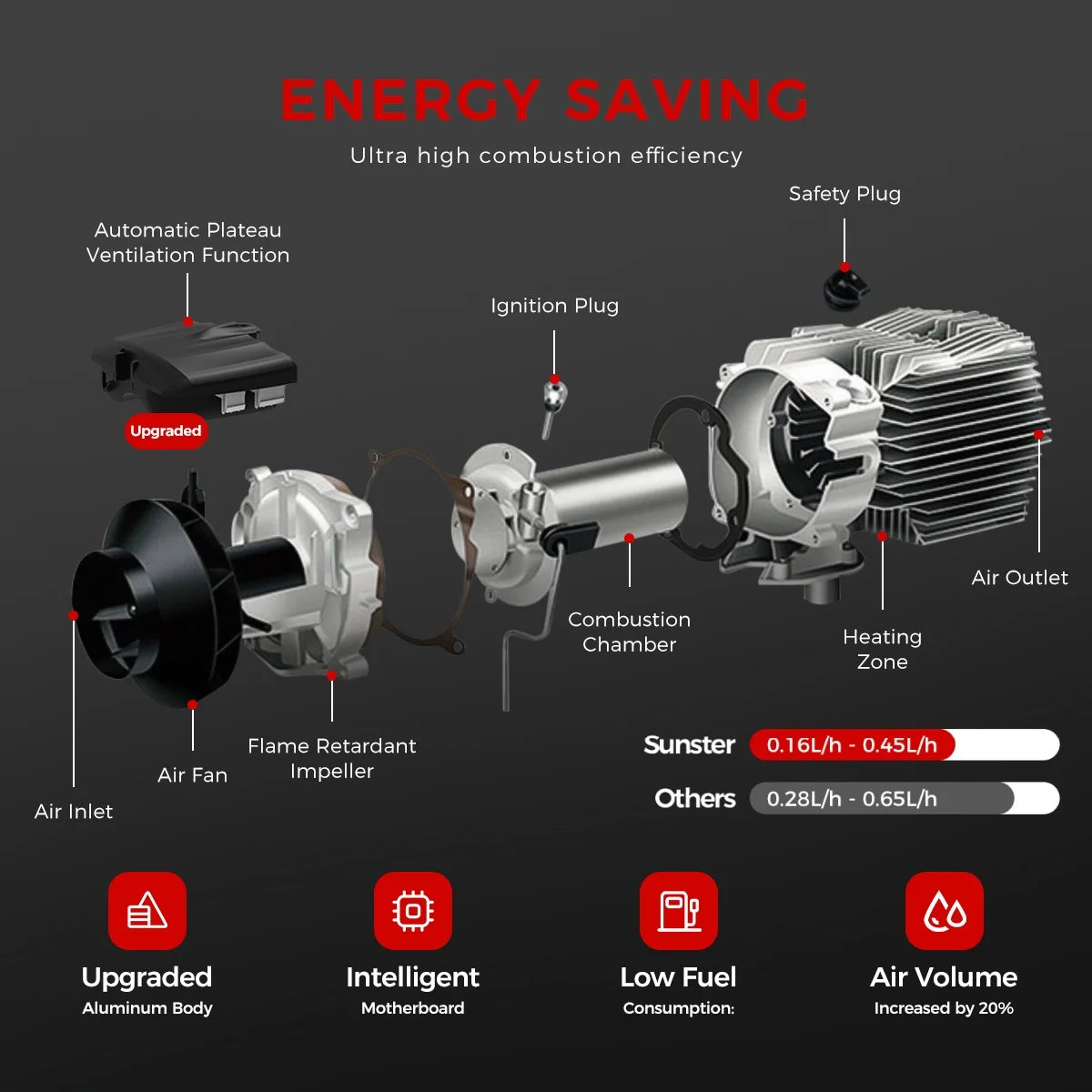 ✅ Low energy consumption and high output: Sunster diesel heater consumes less than 1 gallon per night, reducing fuel consumption to 0.16-0.45 L/h. Equipped with a 5 L/1.3 gallon large capacity fuel tank, it can provide up to 8 hours of continuous heating