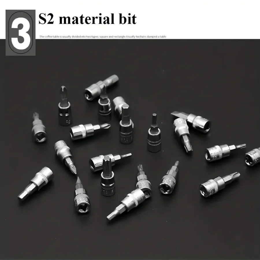 What you get: Our sleeve group includes 21% bit sockets: SL4, 5.5, 7, Ph1, 2, 3 pz1, 2, 2, 3 HEX 3,4,5,6,6,7,6,7,6,7,8 T10, 15,25,20,25,30,40 and 13 PCS 1/1/1/1/1/4 Dr Mockets; 1pc 1/4 fast ratchet handle.
