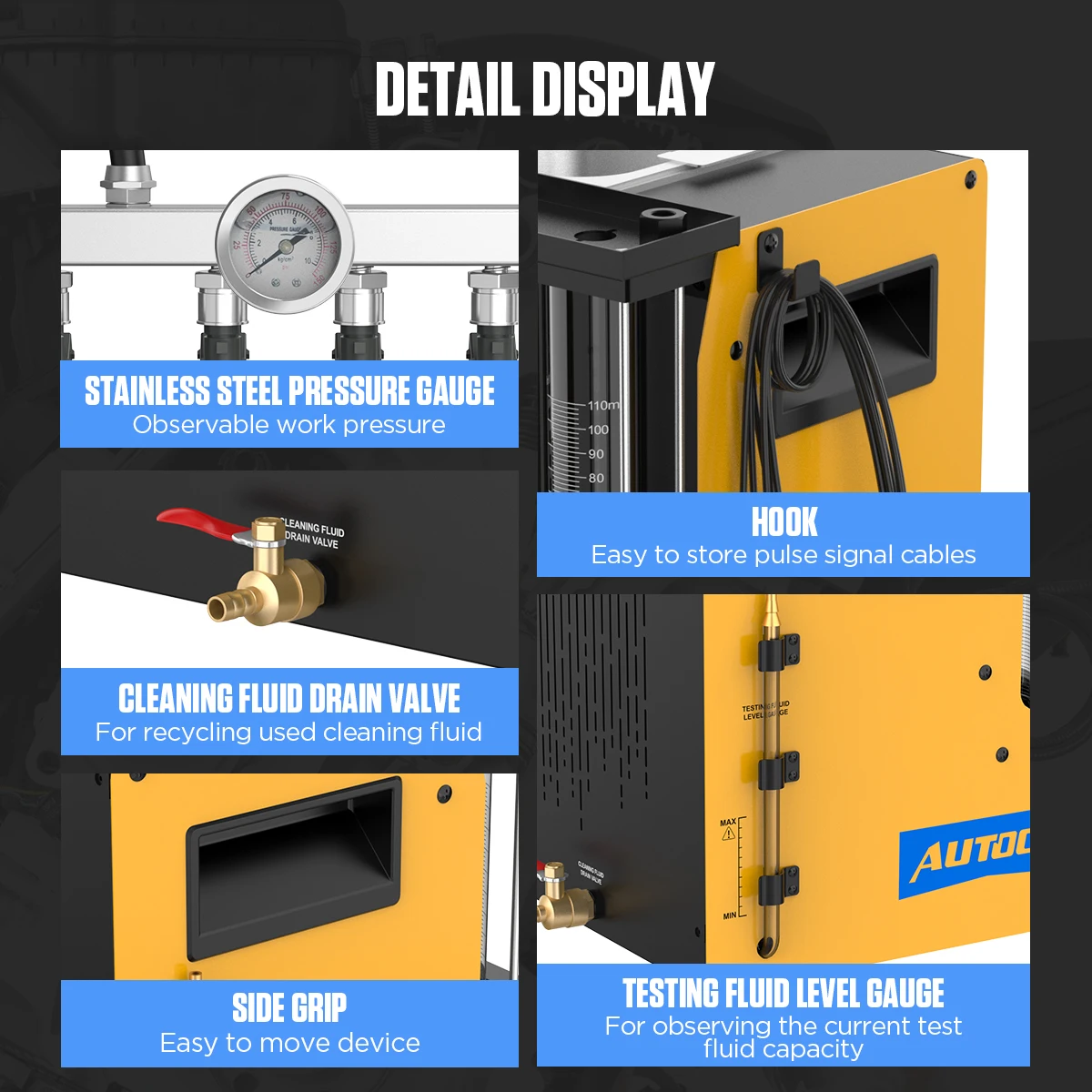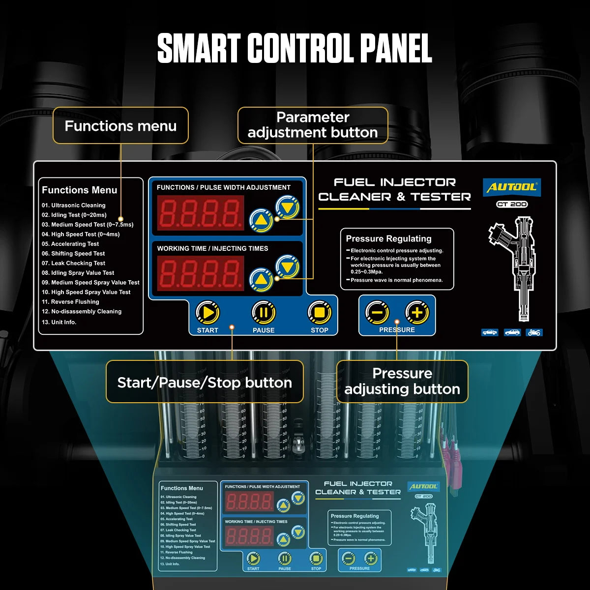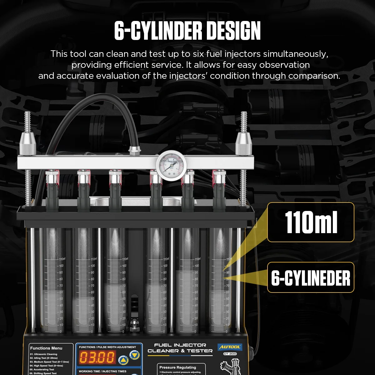 The AUTOOL CT200 injector cleaning and testing machine is designed with wide voltage technology and is suitable for 110V and 220V voltage. It is combined with ultrasonic cleaning technology and microprocessor hydraulic control cleaning detection technology. Fuel pump oil supply simulates low, medium and high engine conditions, cleaning and testing the fuel injectors of the automobile; ultrasonic cleaning can simultaneously clean multiple injectors, which can effectively and completely remove carbon deposit for the automobiles injectors.