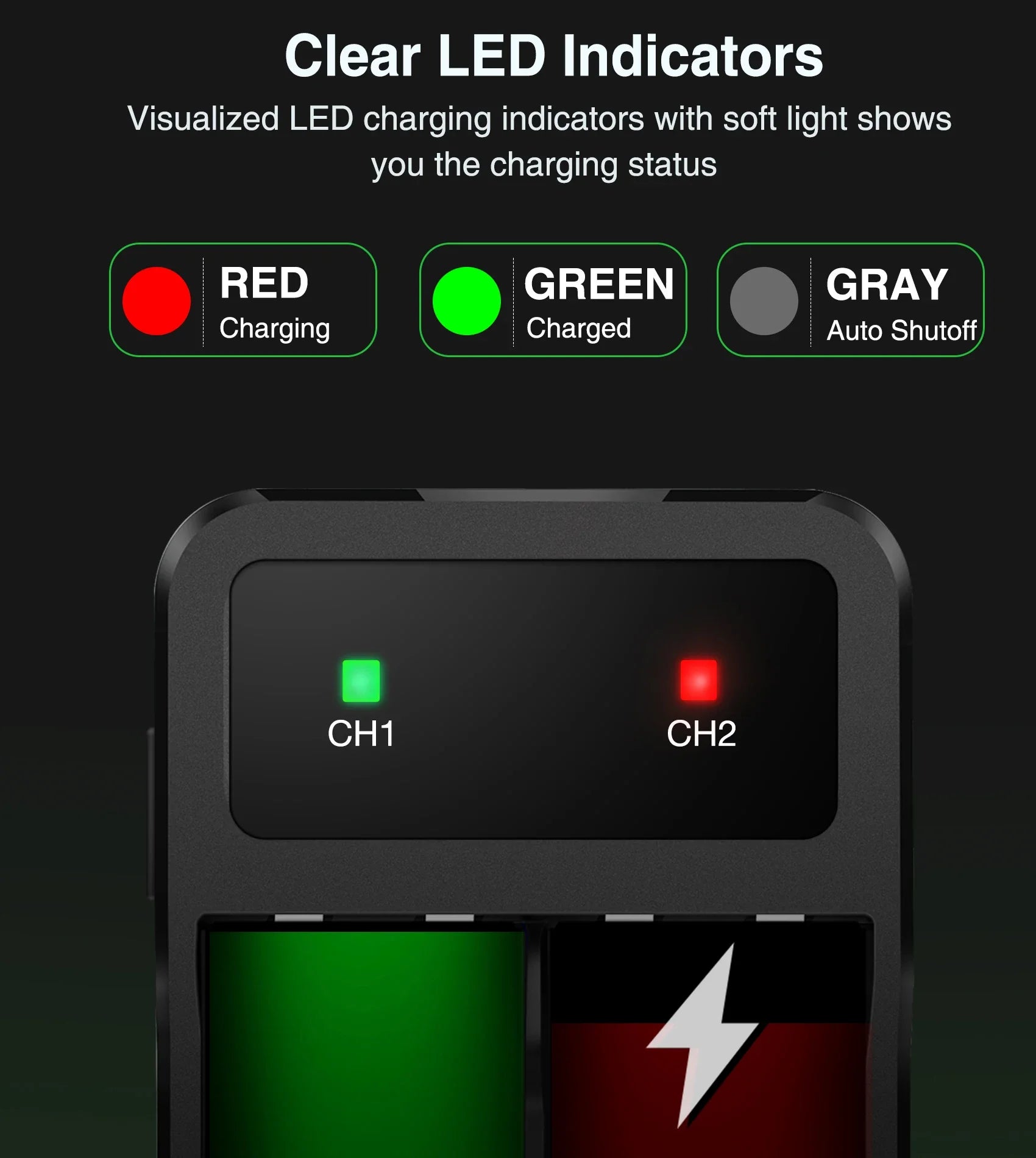 4.Clear LED charging indicator: Smart charging LED battery charger, when the battery pack is charged for more than 5 hours, the charger indicator will turn green, the battery is not fully charged, it will still remain red, if there is no battery in the charger, the two Each charger LED will automatically turn off.