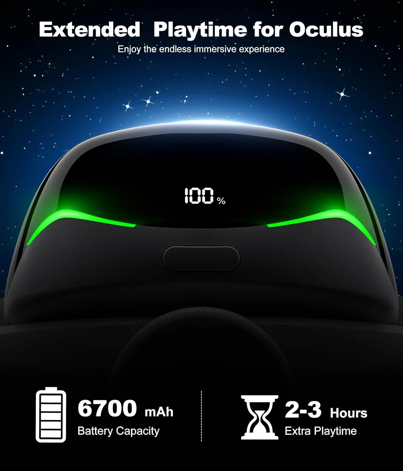 6700mAh Magnetic Battery with LED Display - This head strap for quest 2 comes equipped with a 6700mAh hot-swappable magnetic battery that stays firmly in place—even during intense for VR sessions. It adds an extuira 2–3 hours of playtime. And the blt-in LED indicator keeps you informed of remaining power at a glance, so you can enjoy a seamless, uninterrupted headset strap for VR experience