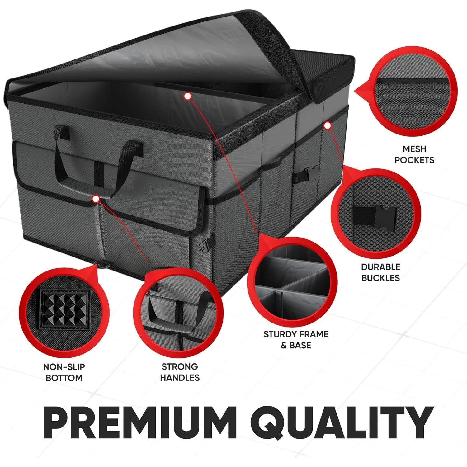 - Sturdy Box Design – premium trunk storage organizer for car is reinforced with rigid base plates to support every side panel. Among car organizers and storage, ours will leave less mess to worry about with multiple side pockets and up to 3 compartments.