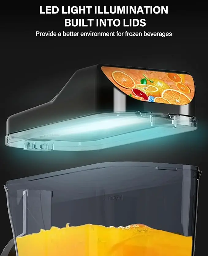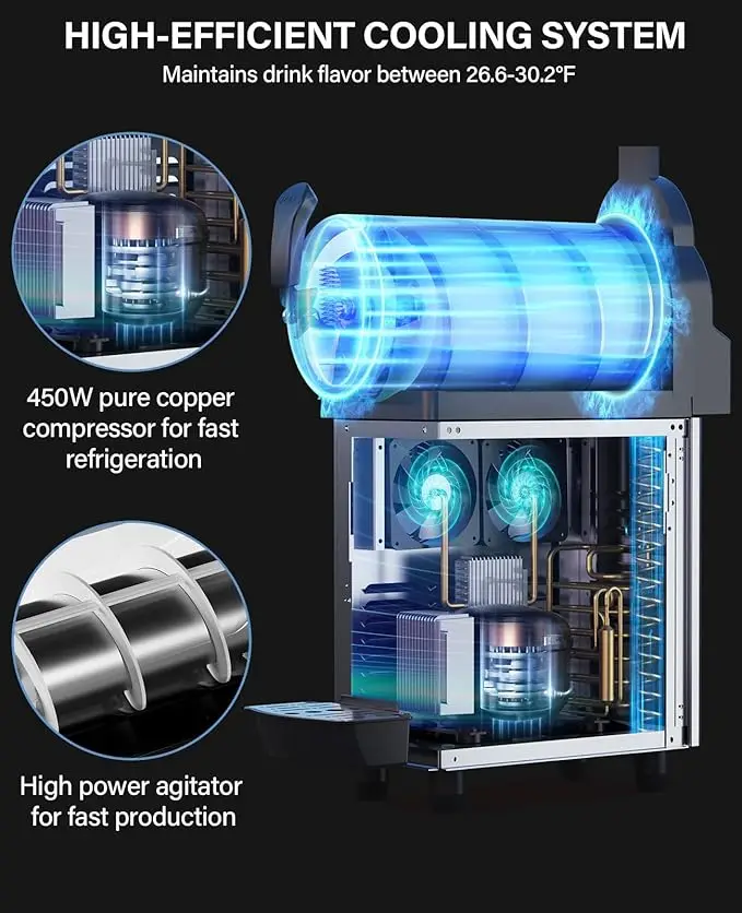 [Powerful Performance]: Our slush machine is equipped with a powerful 450W compressor and copper condenser to produce beautiful frozen slush drinks quickly, with lower power, faster cooling, energy saving and lower noise than similar compressors