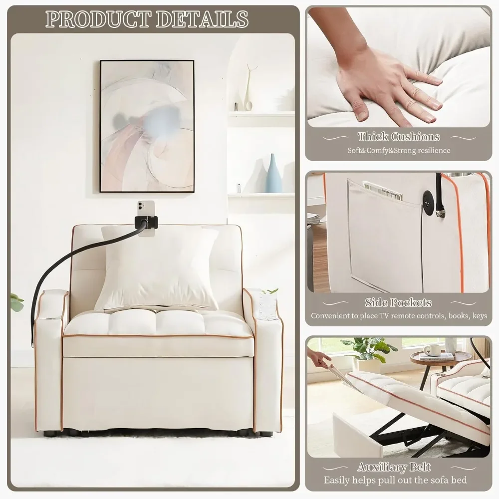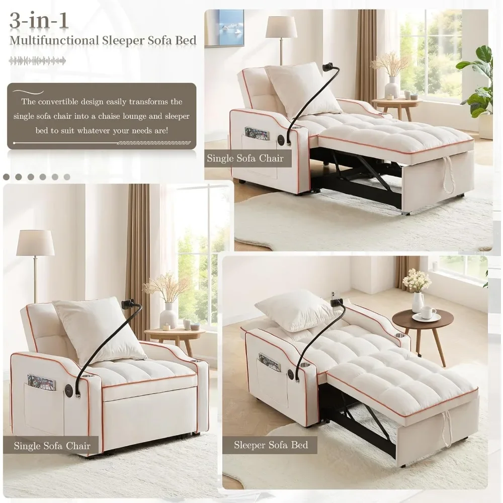 "Convertible Sleeper Chair Bed, 3-in-1 Velvet Futon Sofa with Phone Holder & USB Ports, Pull-Out Design & Adjustable Recline for