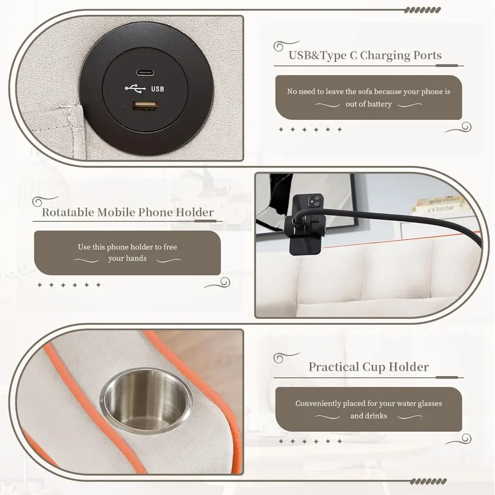 USB Port, Mobile Phone Holder and Cup Holder: There is 1 USB charging port and 1 Type-C port on the right armrest of the sofa chair, allowing you to charge your devices at any time. The adjustable phone holder design allows you to relax your arms when using your phone. 2 cup holders can hold drinks, providing great convenience for your daily life. The side pockets can be used to store magazines, books, remote controls or glasses.