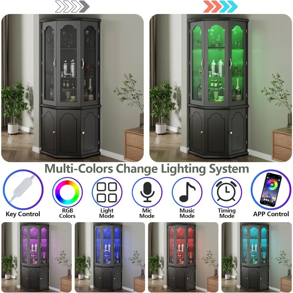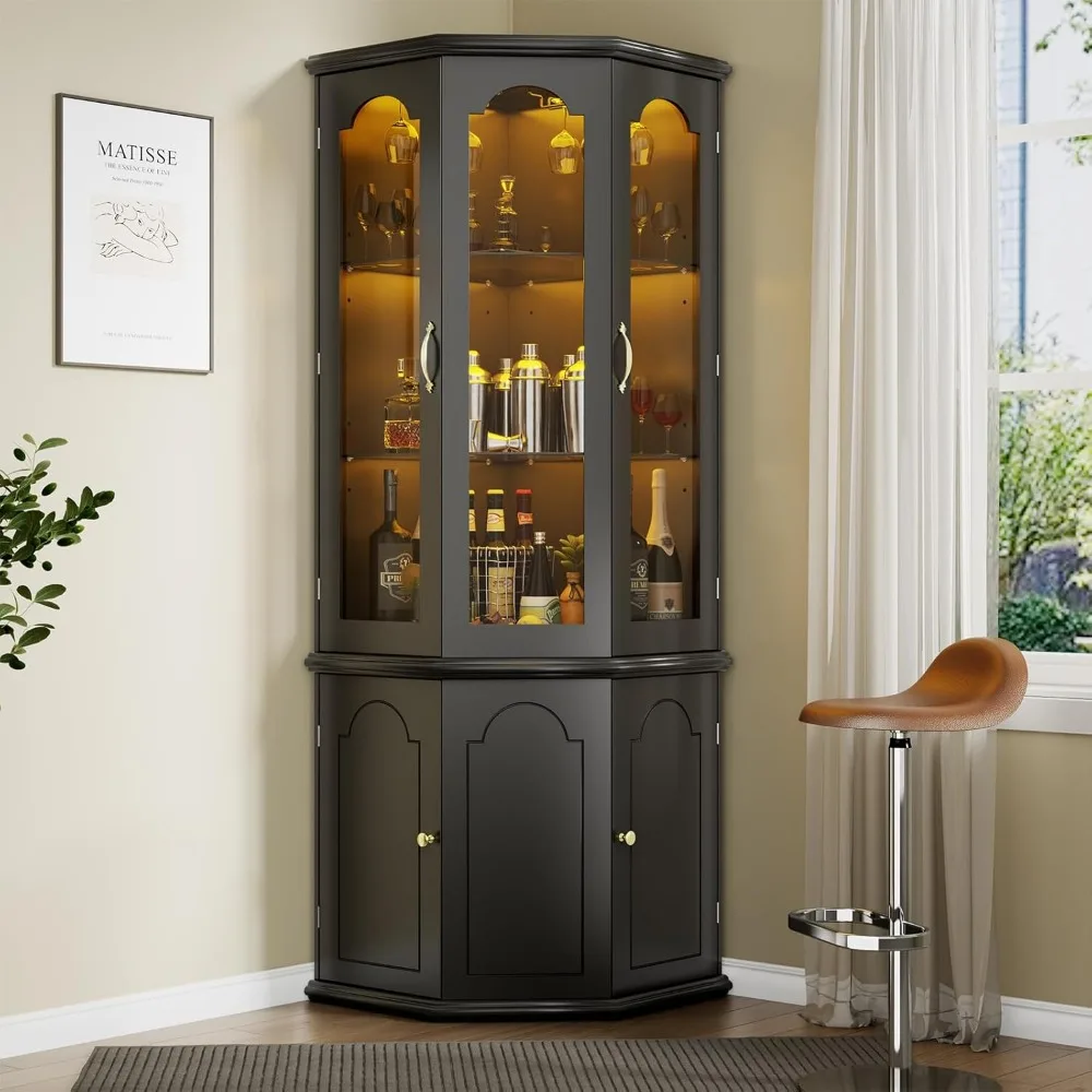 - [Wine Cabinet with LED Light] The inclusion of LED lights adds a touch of style and sophistication to this wine storage cabinet. Features LED lights that can be set to various colors and intensities, allowing you to create a captivating ambiance in your space while allowing you to display it in a visually appealing manner, making the wine collection a focal point in the room. Whether you're hosting a gathering or simply enjoying a quiet evening, the LED lights in the corner wine cabinet enhance the overall atmosphere and elevate your wine experience.