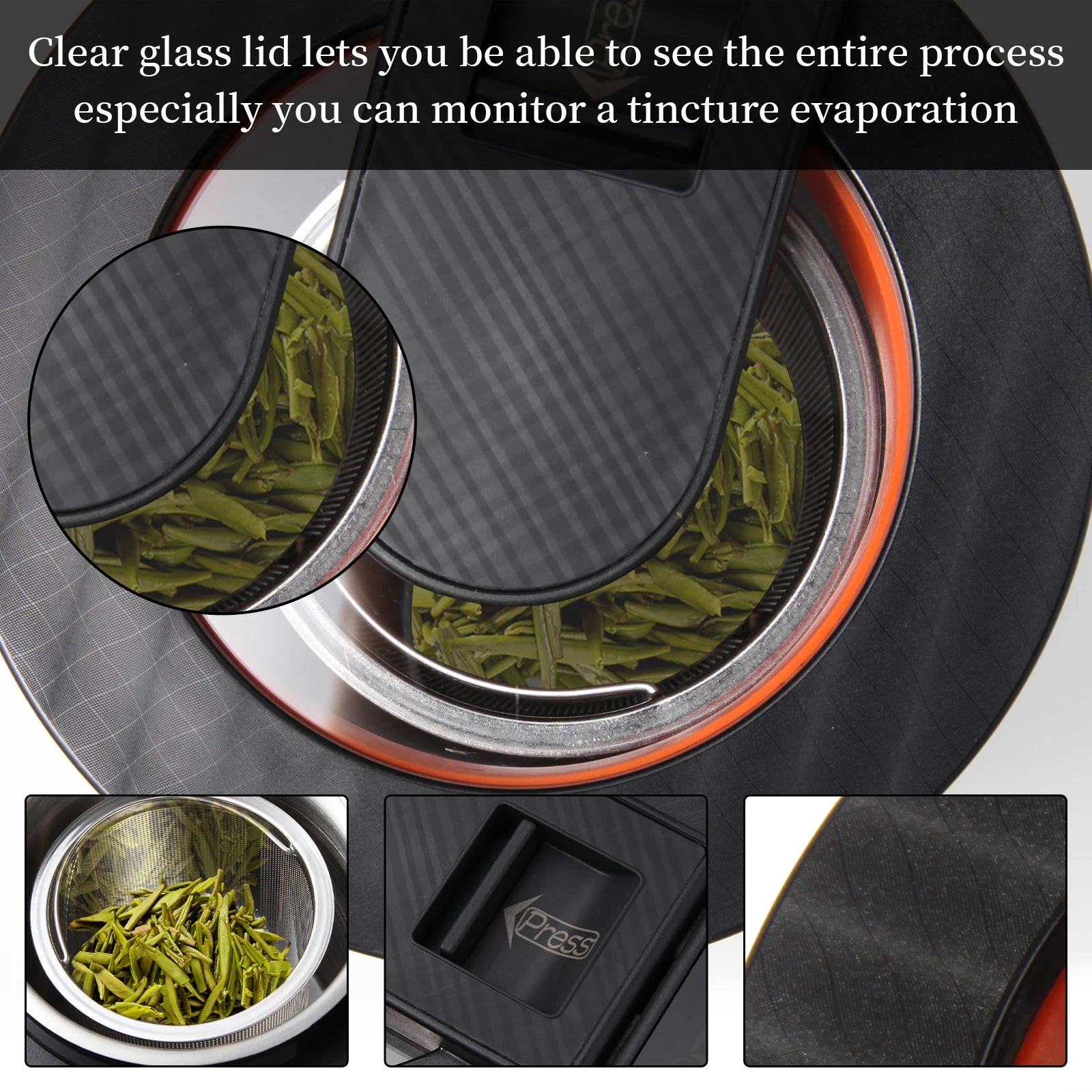 Glass lid lets you be able to see the entire process, especially, for monitoring tincture evaporation.