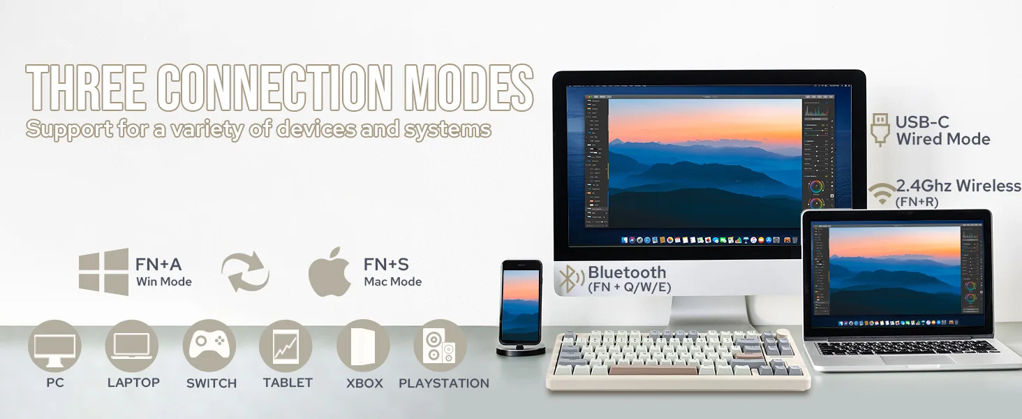 The Galaxy70 is engineered for adaptability, offering Bluetooth, 2.4GHz wireless, and wired USB options to suit every setup. Whether you're aiming for a sleek, wireless workspace or require the reliability of a wired connection, this keyboard seamlessly meets your demands. Powering your productivity and play, its robust 4000mAh battery ensures prolonged performance. With this substantial battery life, the Galaxy70 stands ready to support extended work sessions and gaming marathons, keeping pace with your dynamic lifestyle.