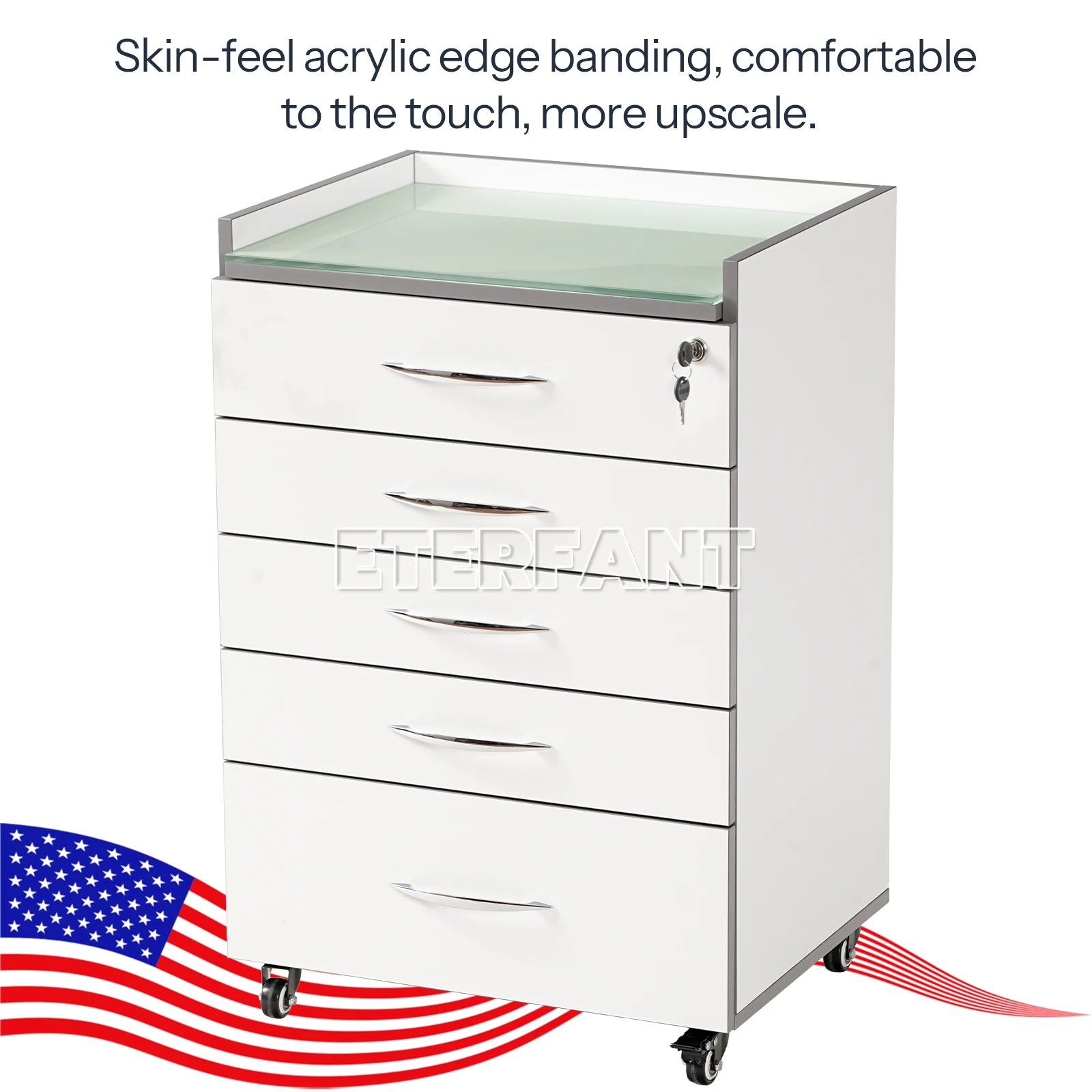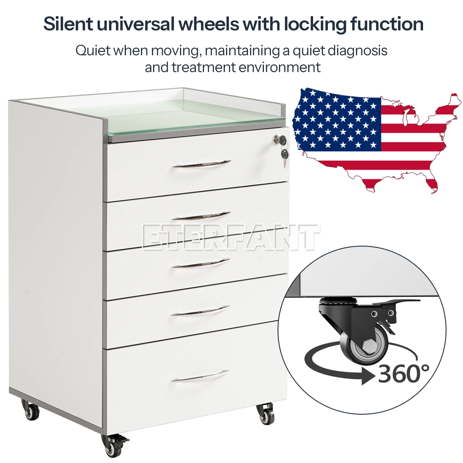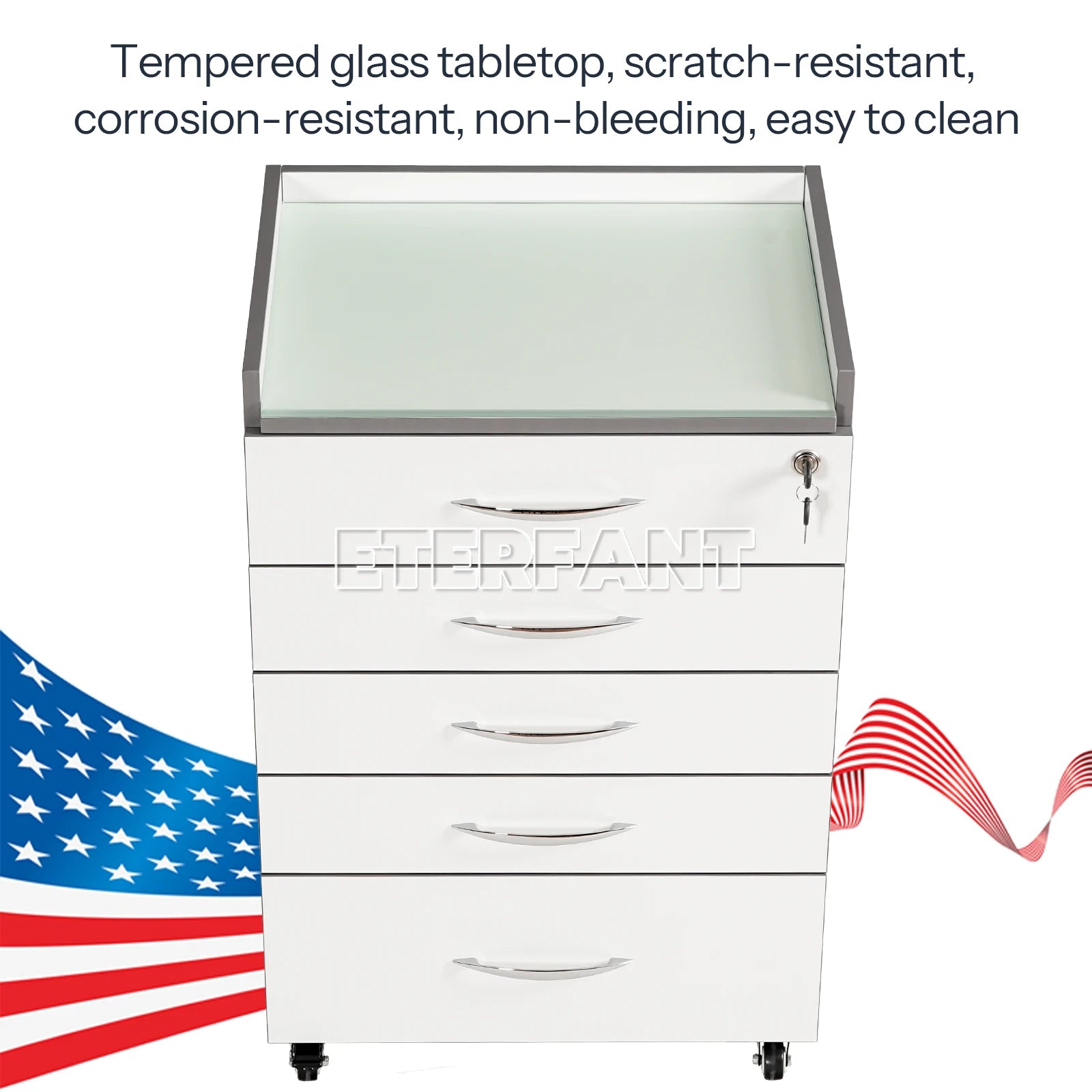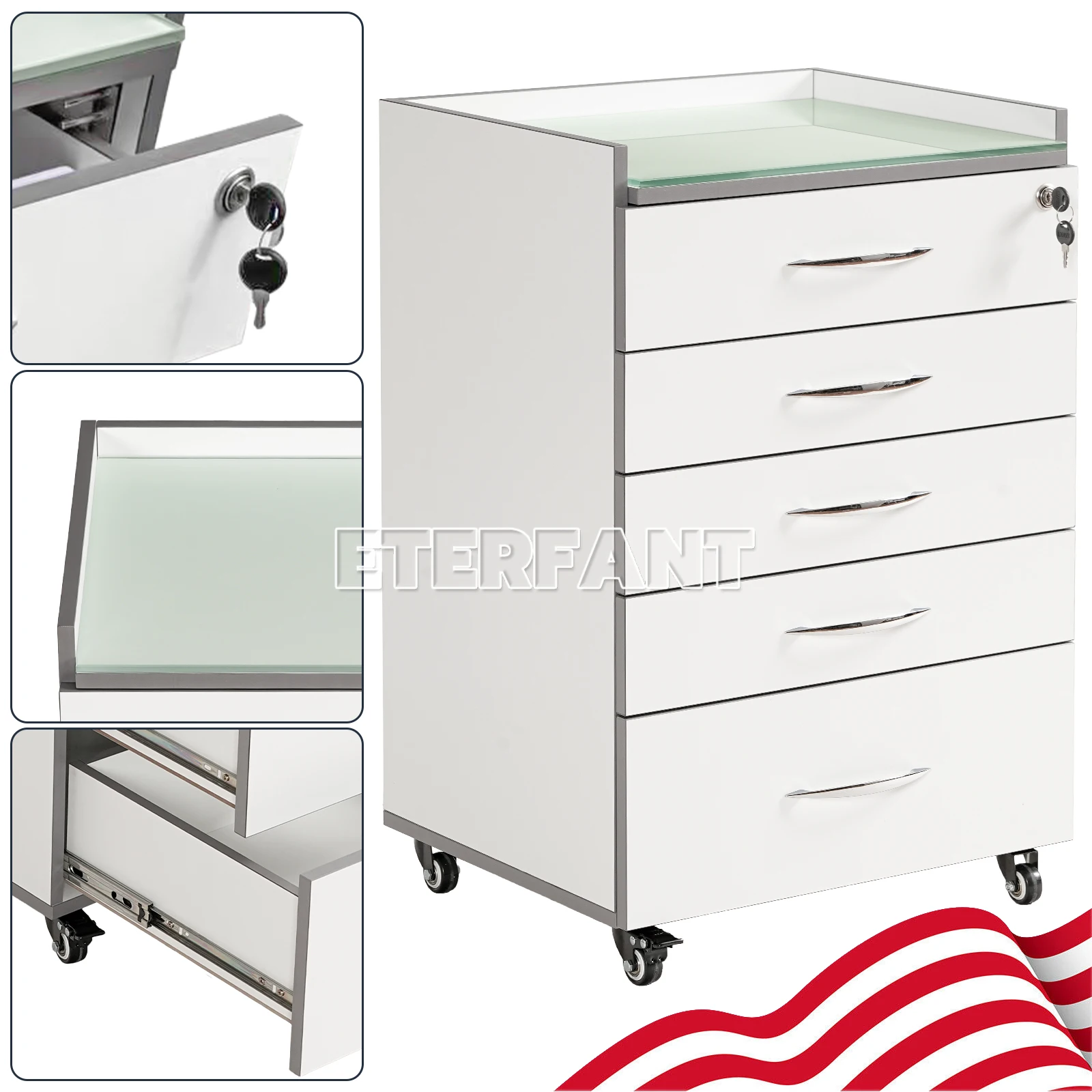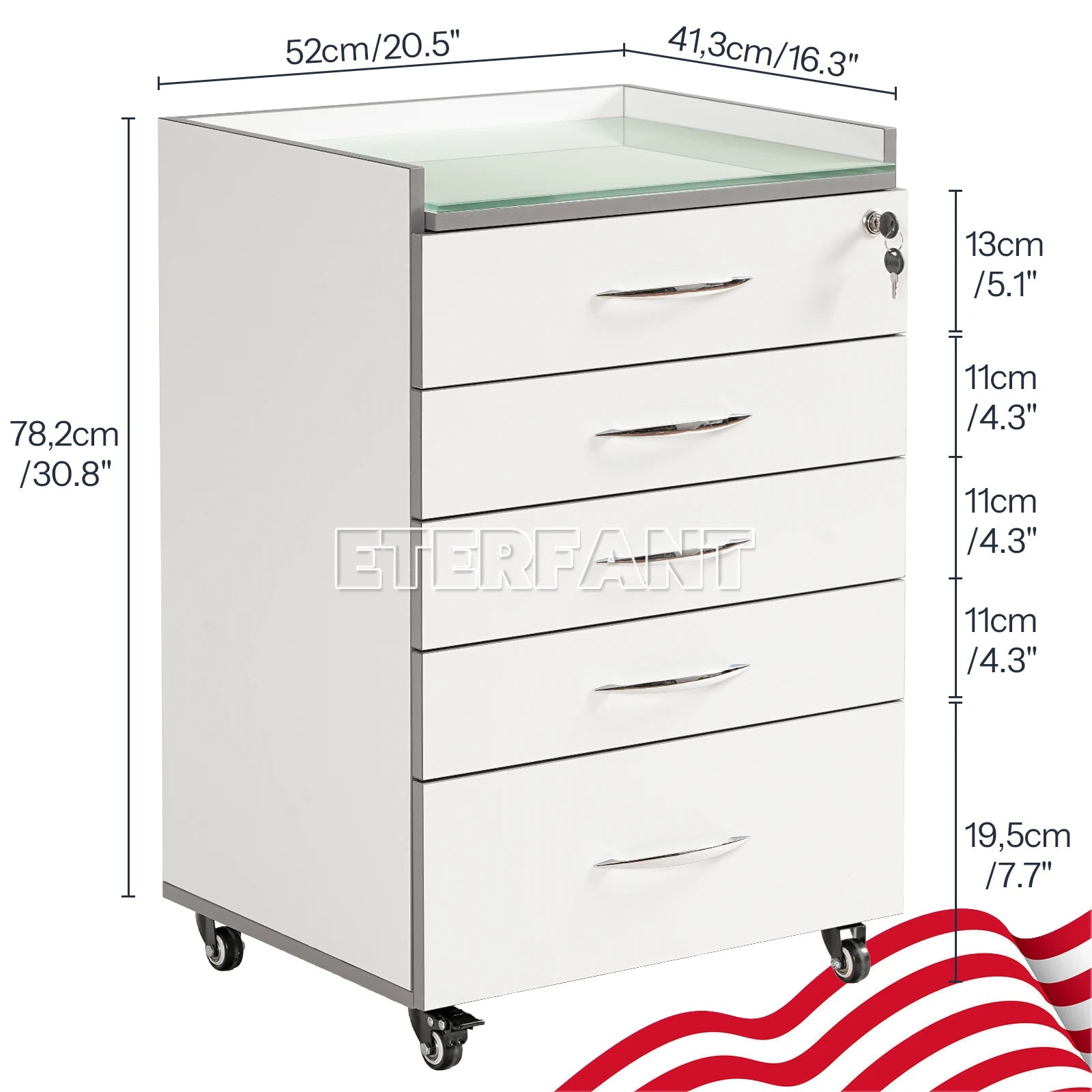 ETERFANT Dental Cabinet Rolling Medical Trolley Mobile Wooden Cart with Socket 5 Drawers Tempered Glass Tabletop Engineered Wood