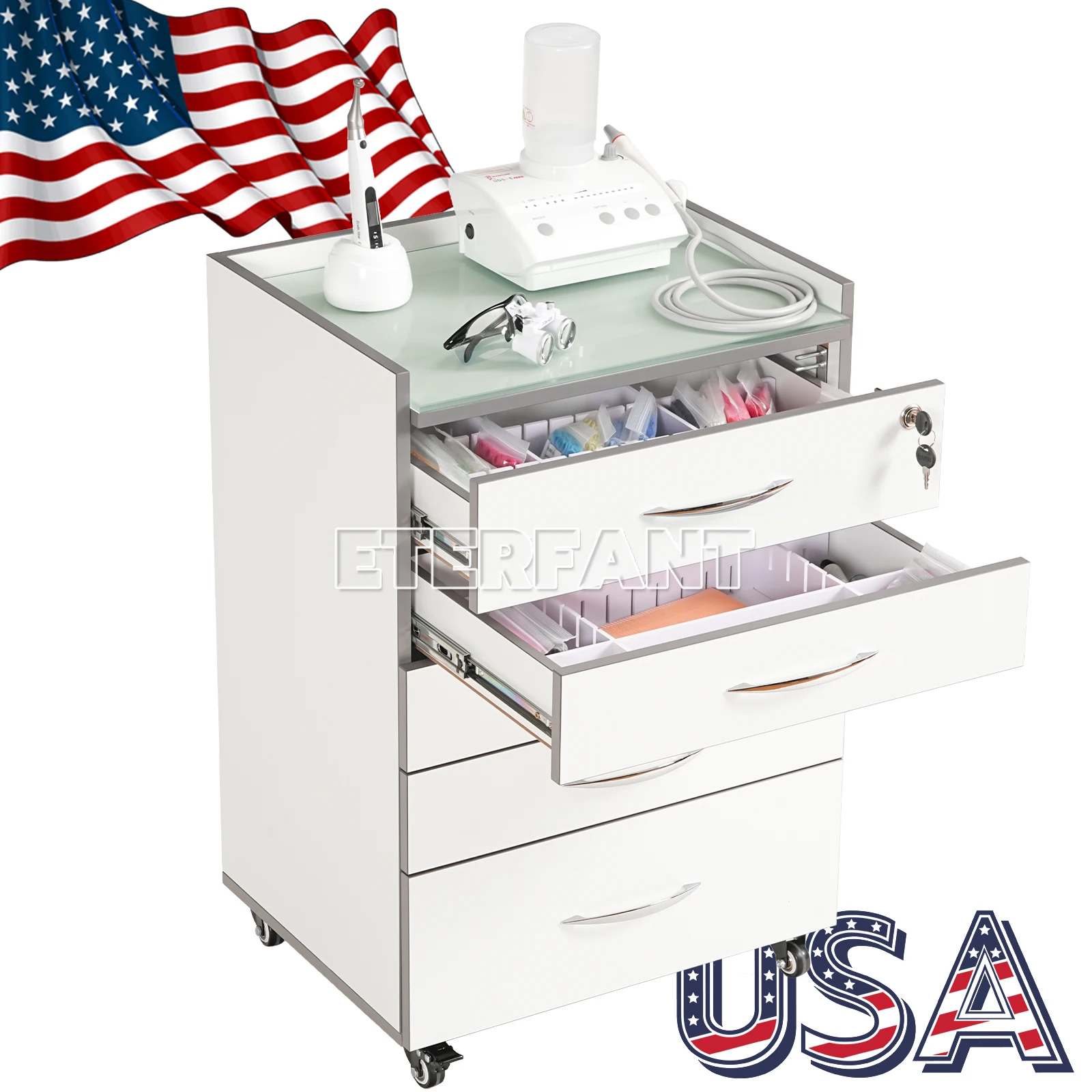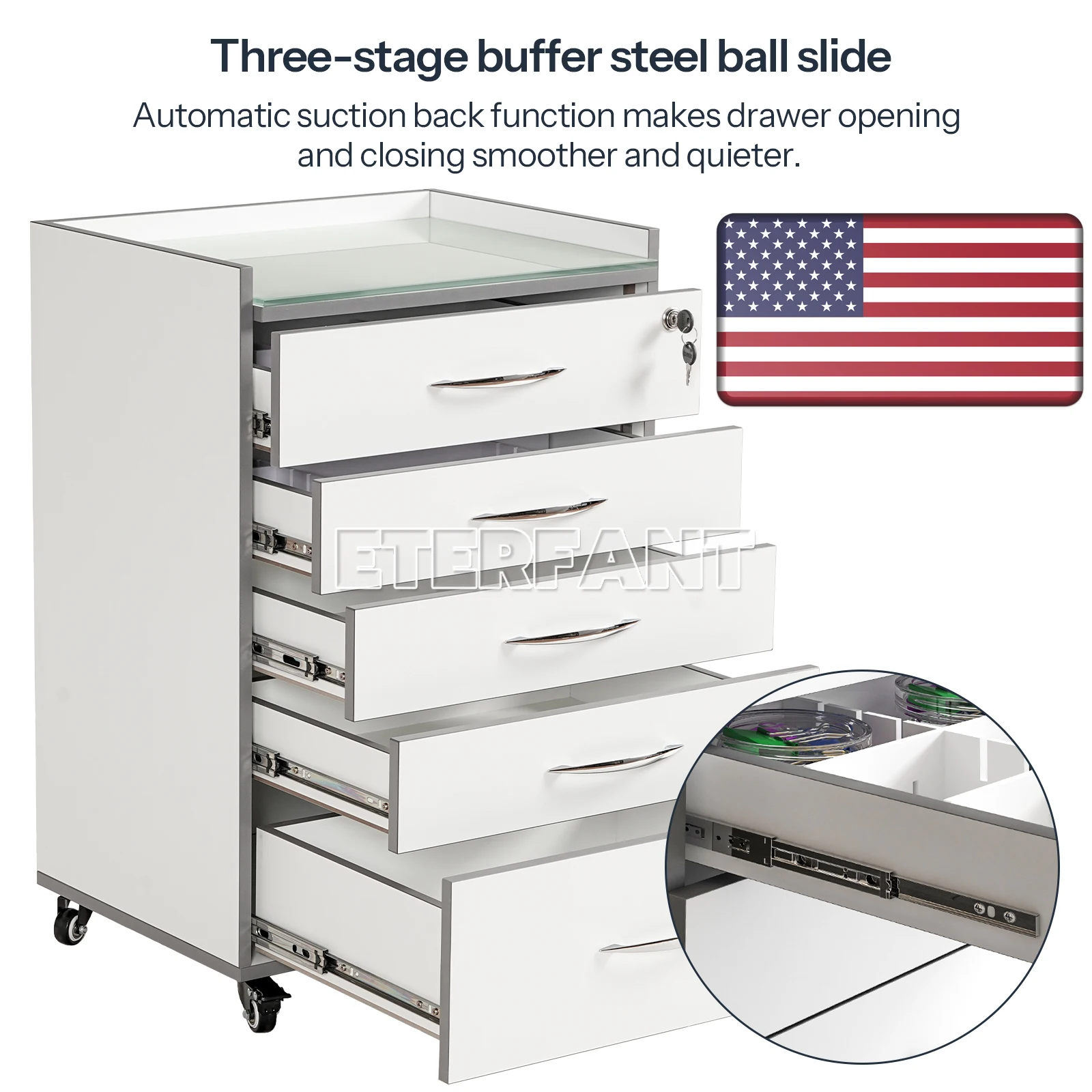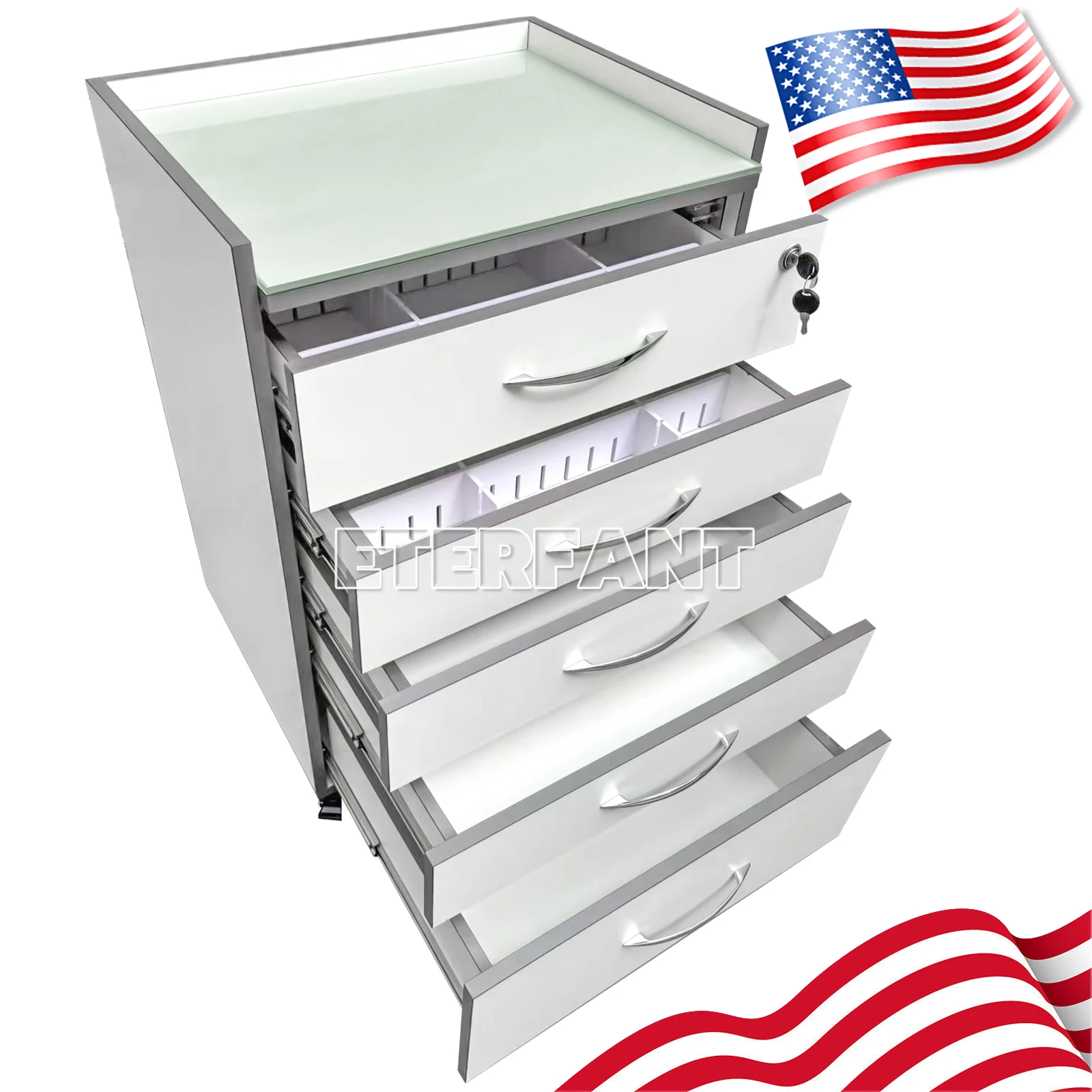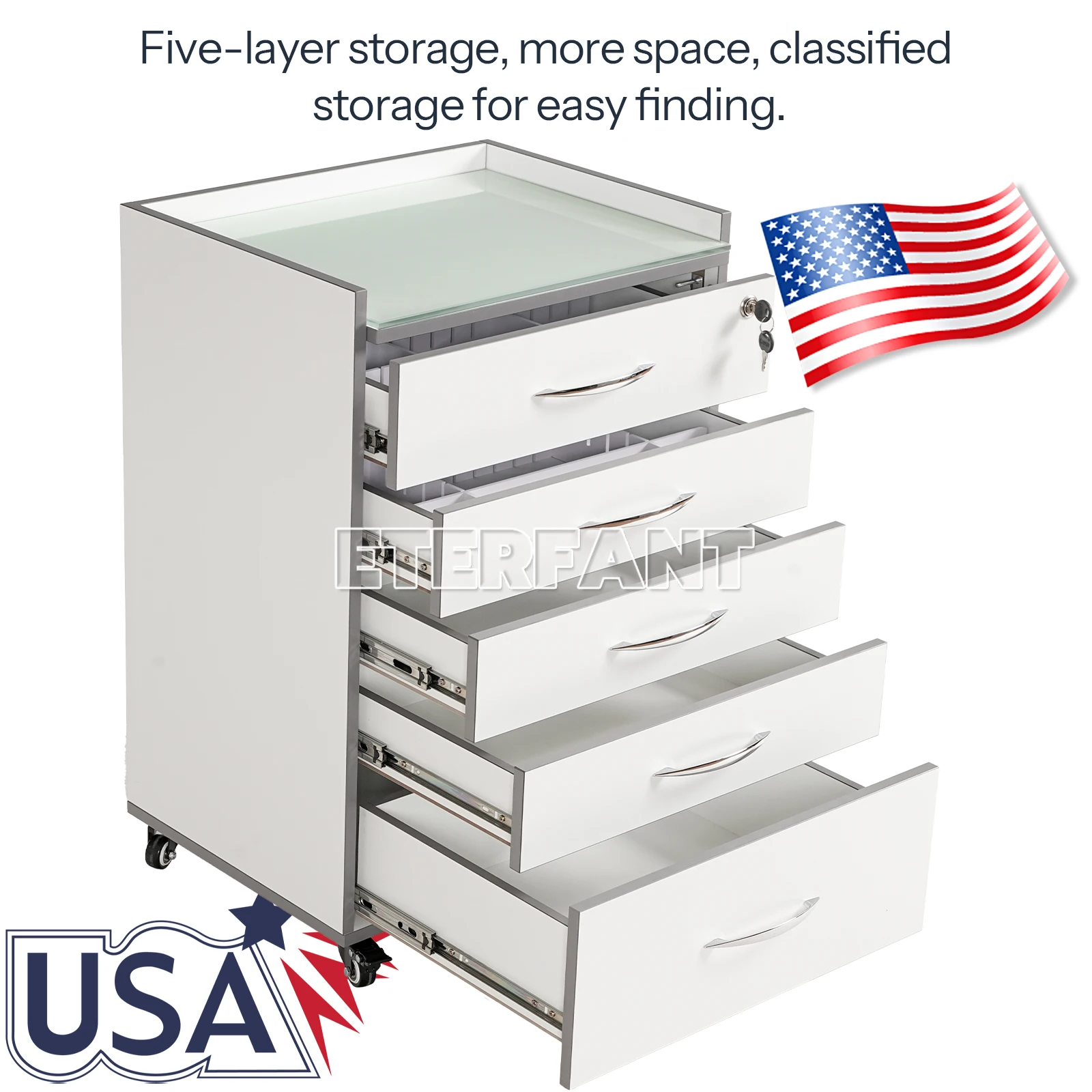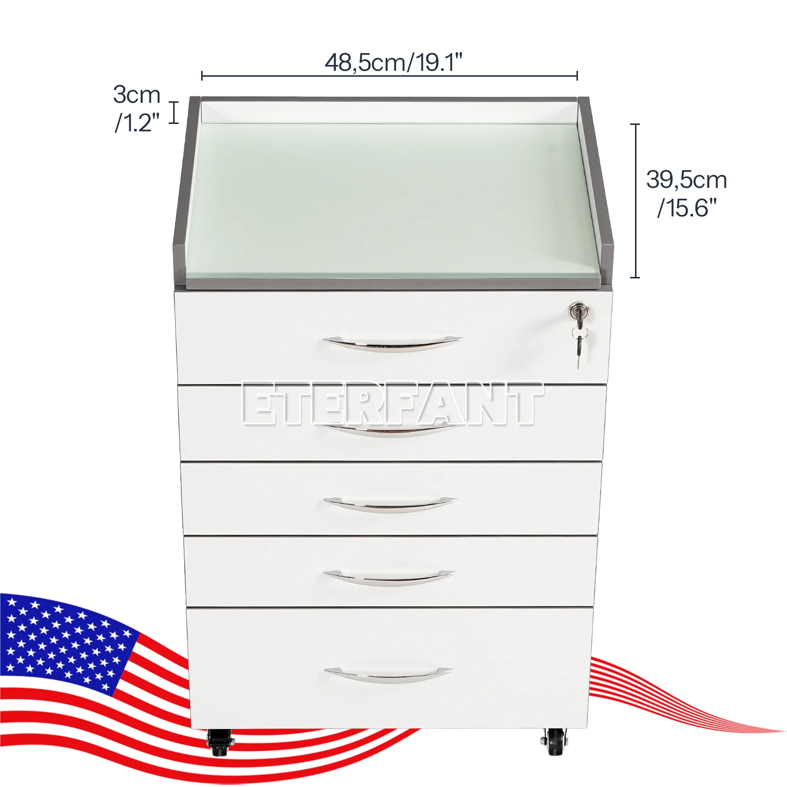 ETERFANT Dental Cabinet Rolling Medical Trolley Mobile Wooden Cart with Socket 5 Drawers Tempered Glass Tabletop Engineered Wood