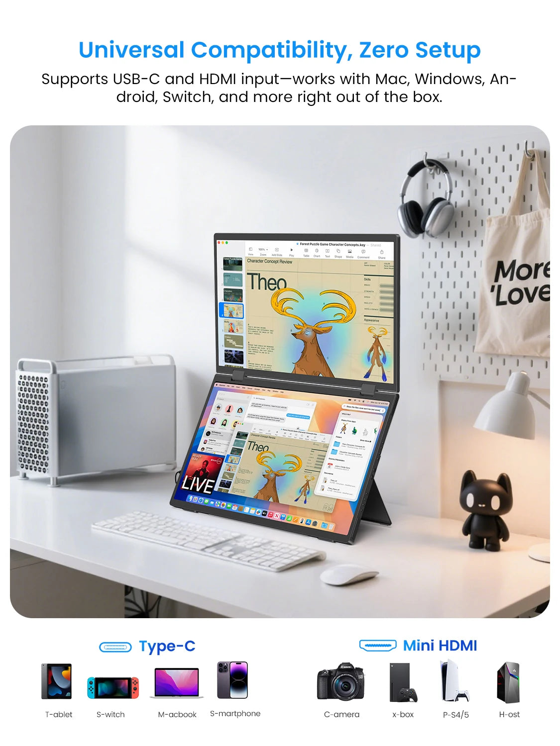 Versatile Folding Monitor: Share your screen effortlessly in all directions with 0-360° rotation, ideal for collaborating with colleagues or partners; Built-in gravity sensors enable 180° automatic rotation, and supports duplicate, expand, split, landscape, and portrait modes for easy switching; Perfect for multi-screen simultaneous and independent displays