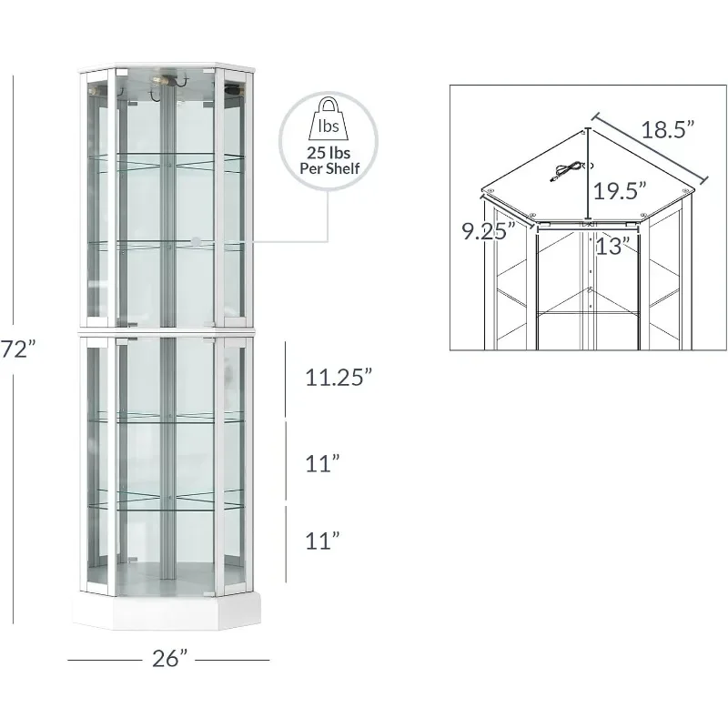 [Plenty of Gorgeous Display Space] - This storage cabinet has fantastic 2 side-hung glass pane doors and a total of 6 triangular corner shelves divided into two sections. Shelves are adjustable to your liking. An included light lets you add extra flair and beaming light to whatever you choose to display inside. Mirrored back panels help create a grand showcase.