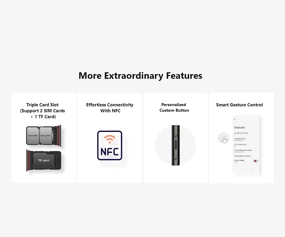 16GB RAM (6GB + Up to10GB Extended RAM); 256GB ROM
