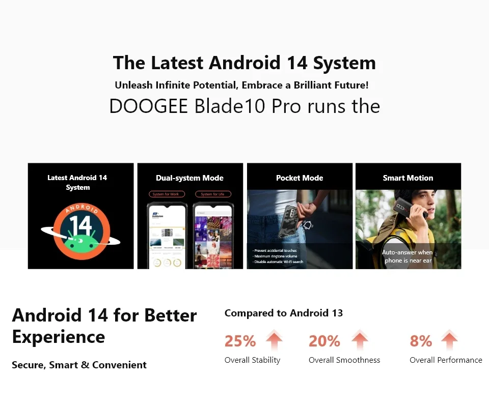 DOOGEE Blade10 Pro runs the Android 14 system, guaranteeing the seamless and efficient operation of diverse applications. Moreover, Android 14 introduces cutting-edge privacy and security features that offer users a range of personalized settings options to cater to their privacy protection requirements.