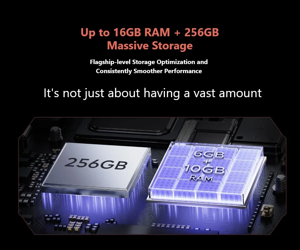 DOOGEE Blade10 Pro offers ample RAM of up to 16GB and 256GB ROM for users to effortlessly switch between social media platforms, video playback, and other apps without experiencing slowdowns.
