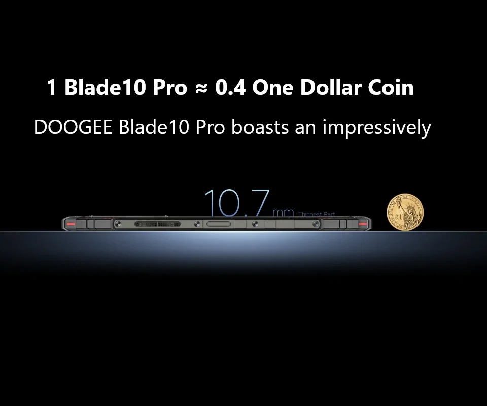DOOGEE Blade10 Pro boasts an impressively slim profile with its 10.7mm thinnest part, making it approximately 0.4 times the thickness of a one dollar coin (26.5mm). This ultra-thin design doesn't compromise on durability or performance, offering a sleek and lightweight rugged phone that excels in both style and functionality.