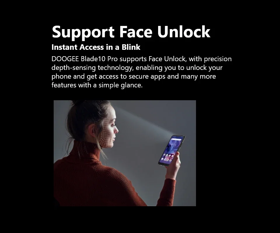 DOOGEE Blade10 Pro supports Face Unlock, with precision depth-sensing technology, enabling you to unlock your phone and get access to secure apps and many more features with a simple glance.