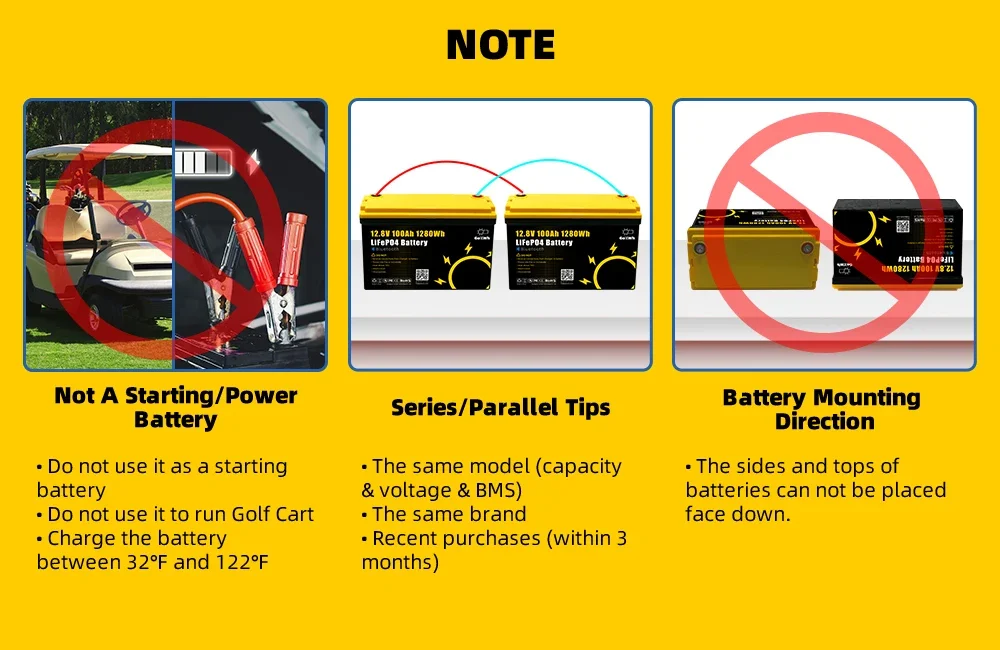 ①Do not charge below O°C; Do not use it as a start battery (such as golf cart), please contact customer service for a better solution.