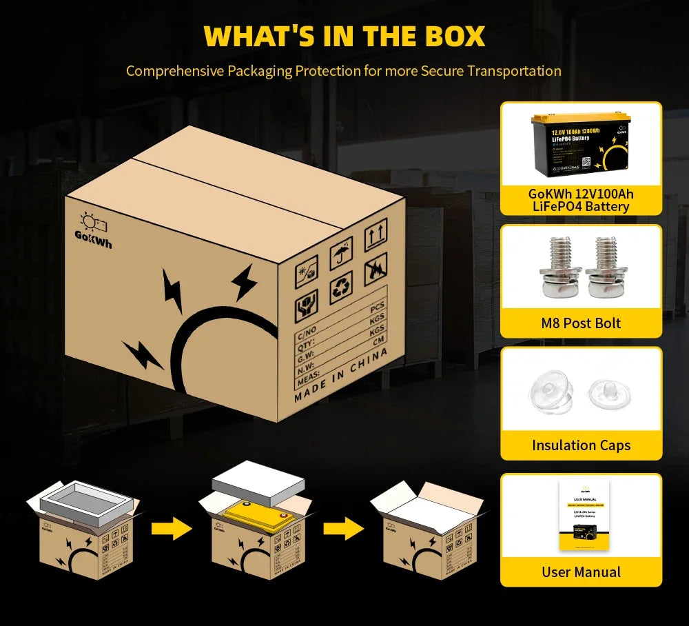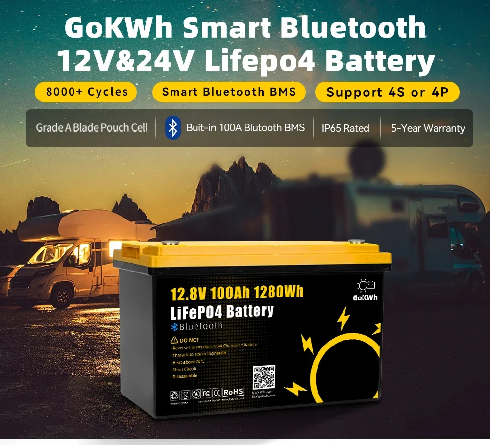 Gokwh LiFePO4 Battery Pack 12V 100Ah with BT 12.8V 1280Wh Cell Built in 100A BMS For 24V 48V RV EV Camping Golf Cart Boat home