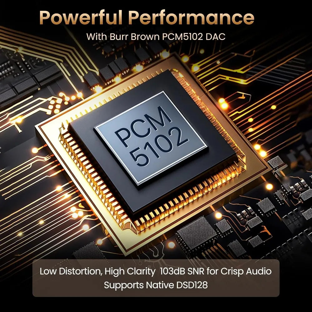 • ♫ [High-Res Lossless Music Player] Advanced PCM510xA DAC with 32‑bit/384kHz decoding and native DSD128 support delivers 103dB SNR and 0.008% THD. Provides 70mW at 32Ω (1.5V line‑out) to drive high‑impedance headphones while supporting distortion‑free playback of FLAC, MP3, WAV, AAC, OGG, AIFF, WMA, APE, DFF, and native DSD (up to 128bit/5.6MHz).