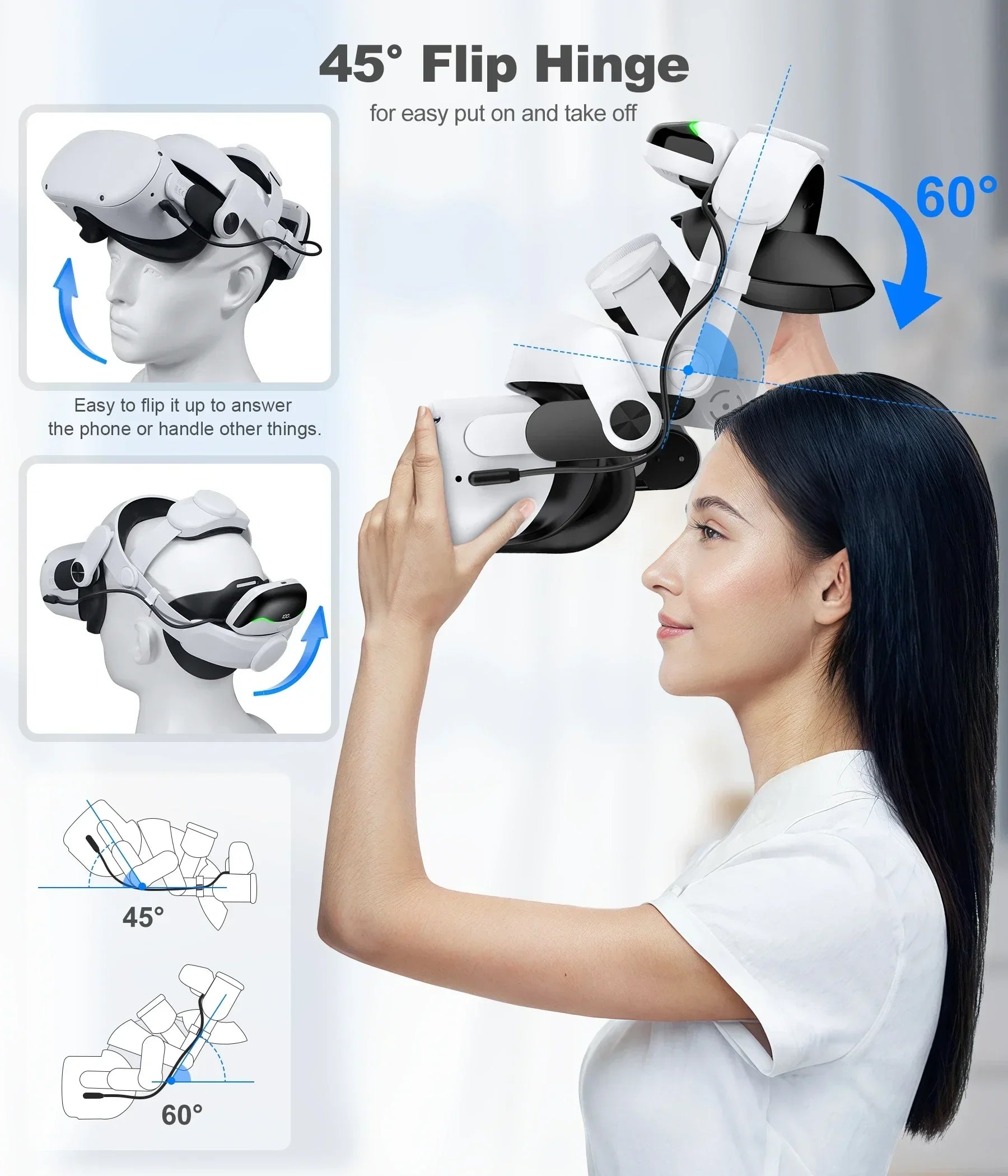 The 55°flippable hinge easily flip up the vr set so you can access real-world without removing the entire headstrap. Very user-friendly for VR game developers and glasses-wearing people.