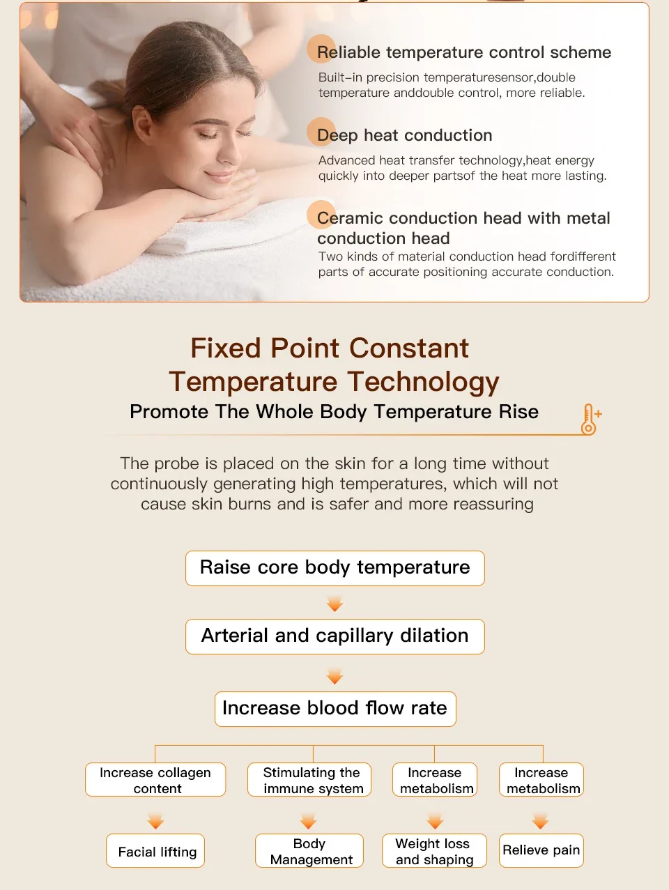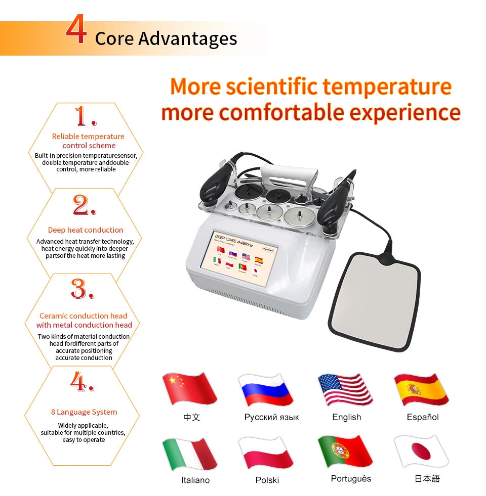 448KHZ is a more appropriate frequency for regulating the activity of ions inside andoutside the cell. lt can effectively help the ions to move across the membrane throughthe cell membrane channel, so that the positive and negative ion exchange of the celis restored to normal, thereby balancing the positive and negative charge of the celland enhancing the activity of the cell Help cells repair their natural functions. Thistechnology has been clinically verified and acts on the body from the inside out to satisfv vour effective aesthetic effect in an effective and painless way. Provide beauty caresolutions for a wide range of beauty applications.