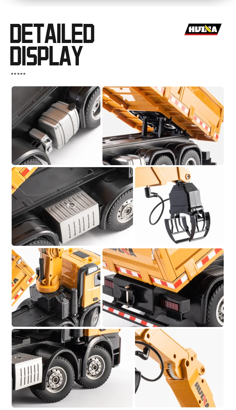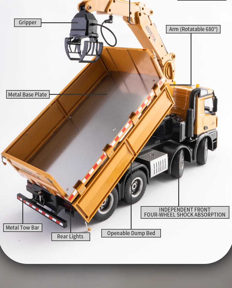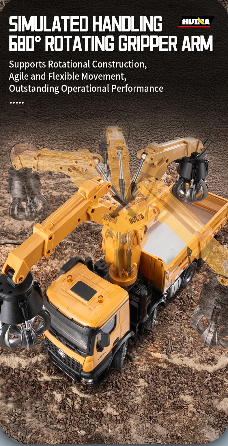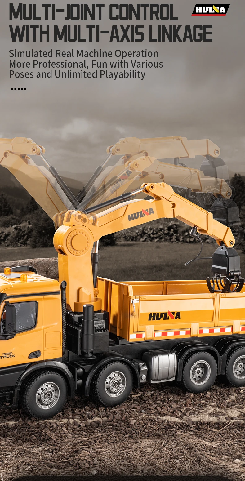 2.4G frequency remote control.Using large capacity lithium batteries with strong power,The grab arm can rotate remotely,the upper arm and lower arm can rise and fall in dependently through remote control.and the simulation action of the grab arm's remote control grasping and releasing.The dump truck has a simulated steering system with flexible movements,remote adjustment of the front wheels, realistic sound and light,and remote control of the body's rise and fall.