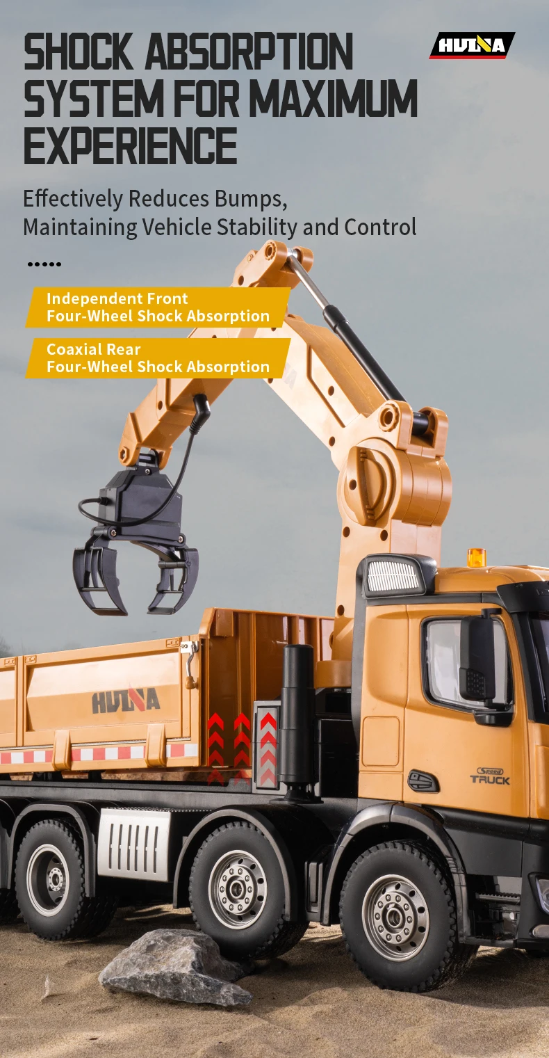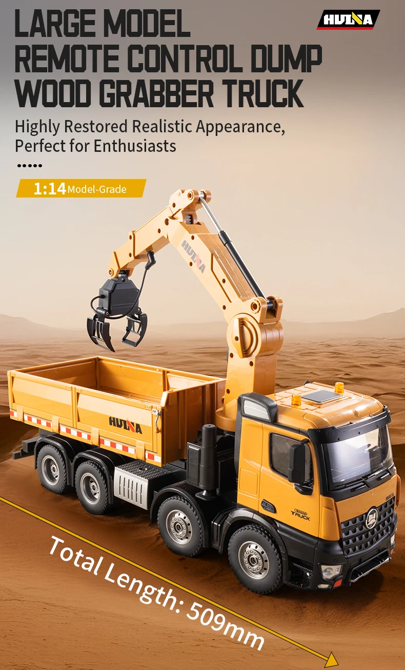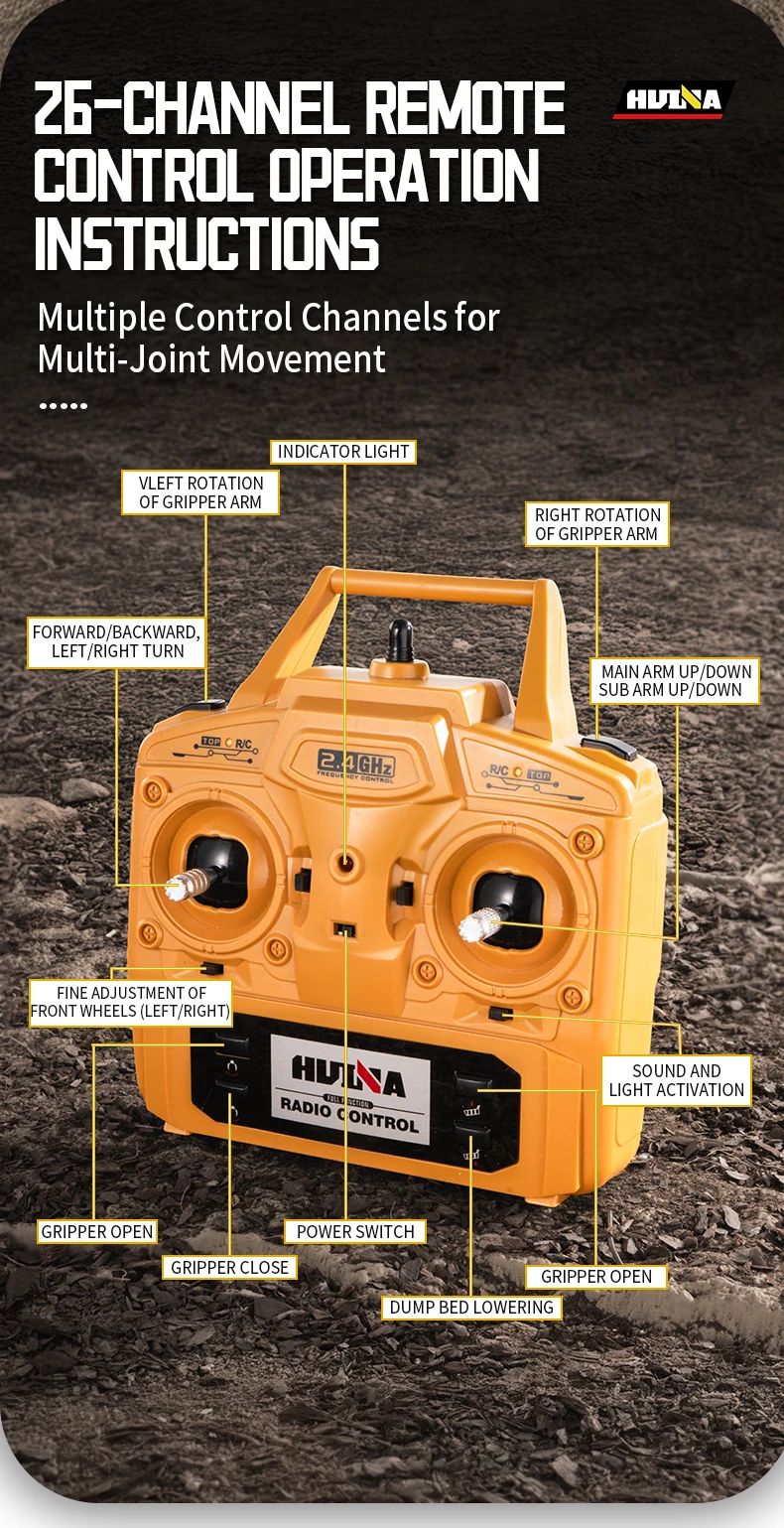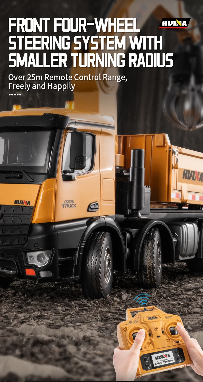 2.4G frequency remote control.Using large capacity lithium batteries with strong power,The grab arm can rotate remotely,the upper arm and lower arm can rise and fall in dependently through remote control.and the simulation action of the grab arm's remote control grasping and releasing.The dump truck has a simulated steering system with flexible movements,remote adjustment of the front wheels, realistic sound and light,and remote control of the body's rise and fall.