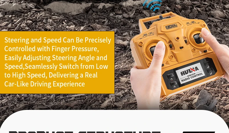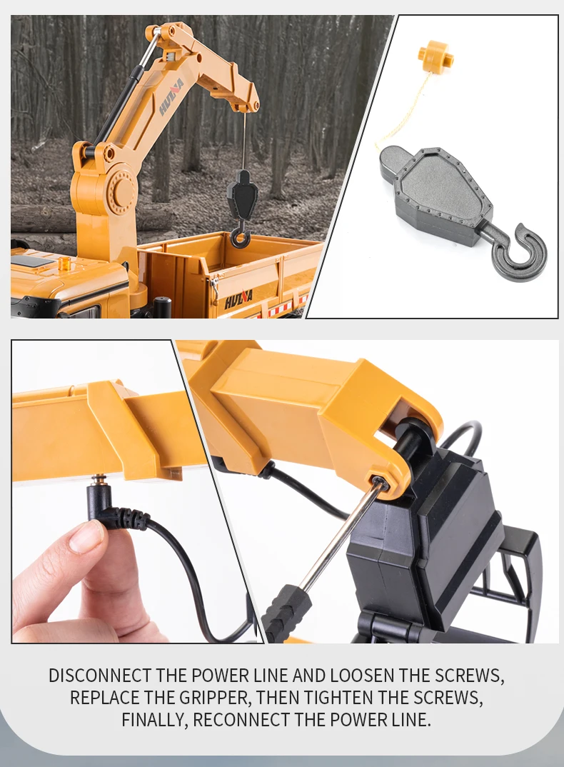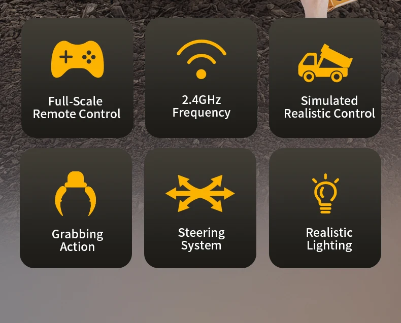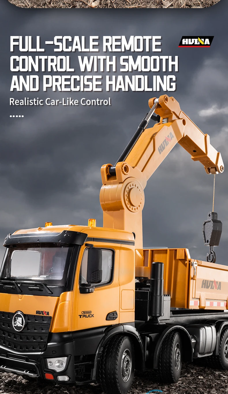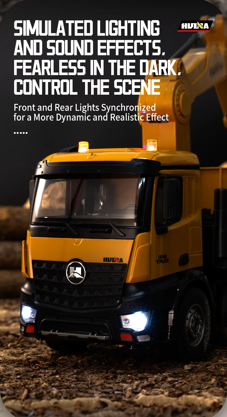 2.4G frequency remote control.Using large capacity lithium batteries with strong power,The grab arm can rotate remotely,the upper arm and lower arm can rise and fall in dependently through remote control.and the simulation action of the grab arm's remote control grasping and releasing.The dump truck has a simulated steering system with flexible movements,remote adjustment of the front wheels, realistic sound and light,and remote control of the body's rise and fall.