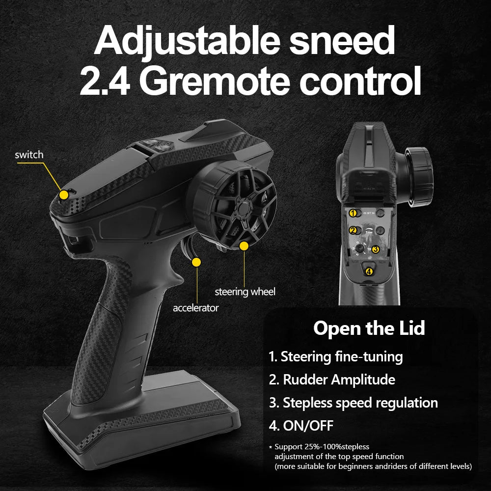 Tires: Narrow front and wide rear, all terrain racing tires, front wheel with a diameter of 75 * 28mm, rear wheel with a diameter of 75 * 33mm
