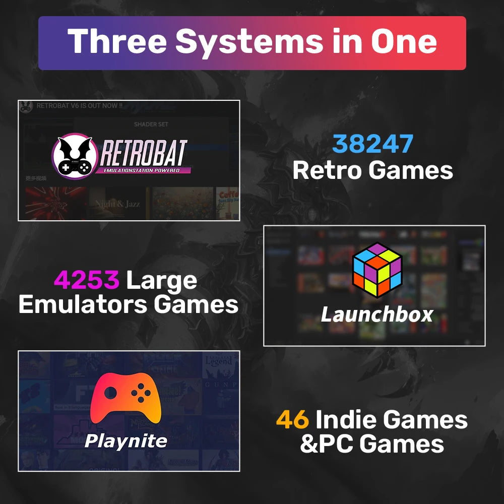 This Mix500G portable video game console has 3 game front ends, Launchbox/Playnite/Retrobat, you can enjoy 3D games, AAA games and retro games.